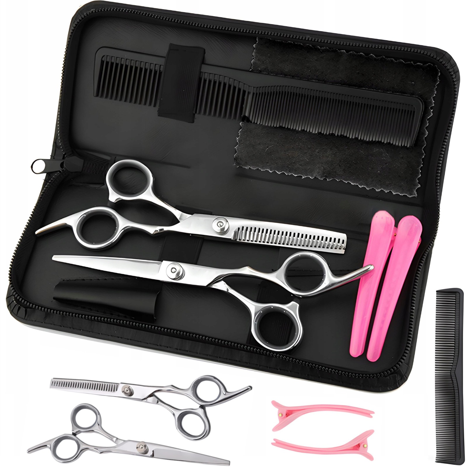 Zestaw narzędzi fryzjerskich do włosów brody w etui nożyce degażówki grzebień spinki - 7 el.