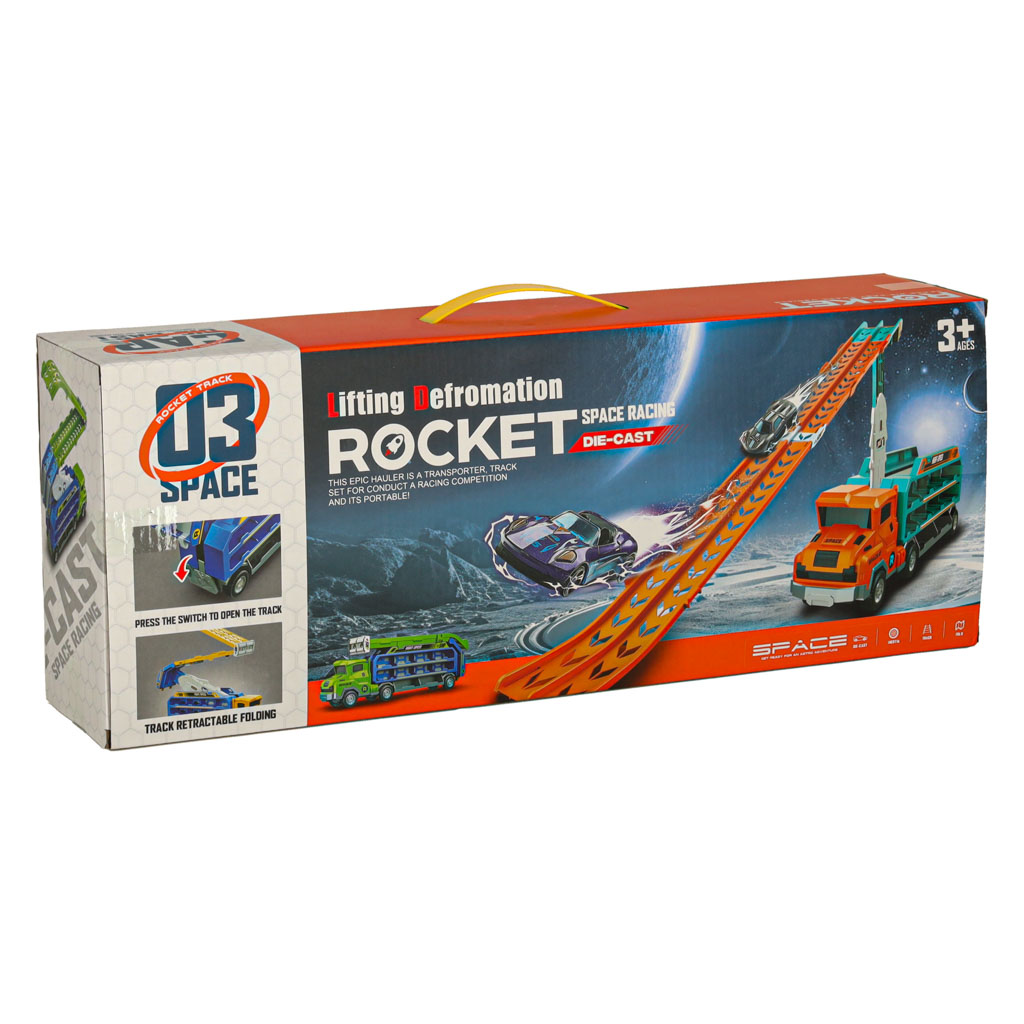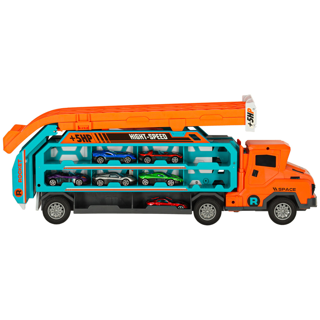 W zestawie znajduje się ciężarówka, sześć samochodów oraz naklejki. Zabawka zapakowana jest w kartonowe opakowanie, co czyni ją idealnym prezentem dla małych pasjonatów motoryzacji. Pomarańczowo-niebieska kolorystyka przyciąga wzrok i zachęca do aktywnej zabawy.