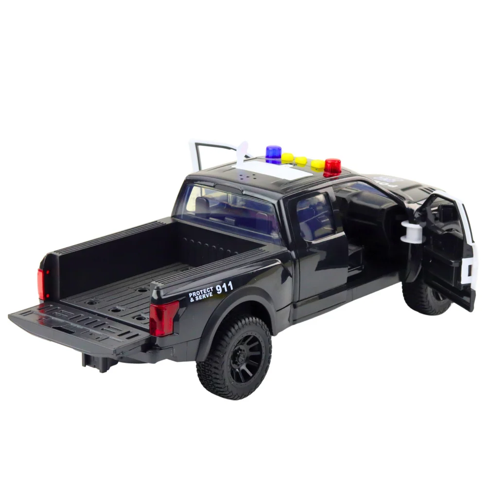 Dodatkowo pojazd wyposażony jest w efekty świetlne i dźwiękowe, które aktywują się po naciśnięciu przycisków na dachu. Te funkcje zwiększają realizm i wciągają dziecko w aktywną zabawę, zachęcając do odgrywania ról i tworzenia własnych przygód. Pickup porusza się płynnie po różnych powierzchniach, a jego duże, terenowe koła dobrze sprawdzają się w warunkach domowych i plenerowych.