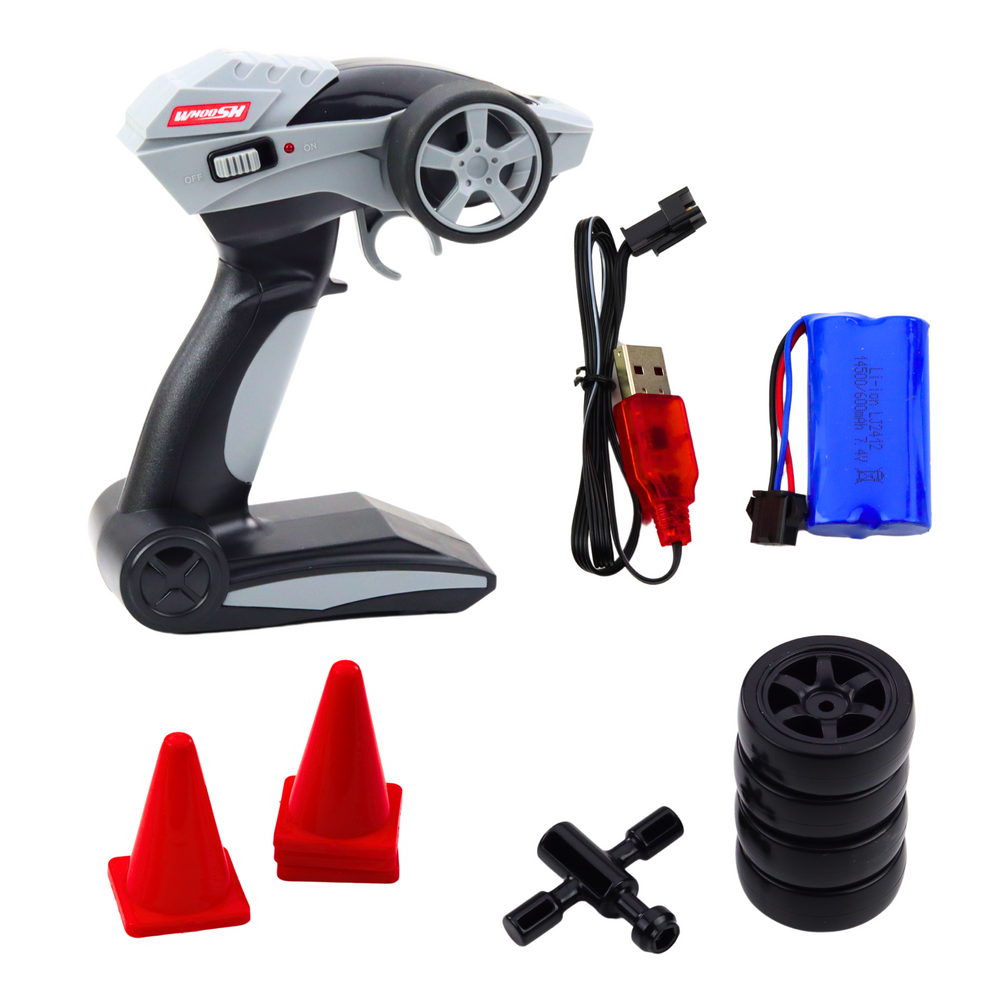 Model wyposażony jest w system oświetlenia LED – przednie i tylne światła oraz neonowe podświetlenie podwozia – które dodają realizmu i stylu. Sterowanie odbywa się za pomocą pilota 2.4 GHz, który gwarantuje zasięg do 25 metrów i błyskawiczną reakcję. Dodatkowy komplet opon, klucz serwisowy oraz pachołki pozwalają stworzyć własny tor do driftu i trenować manewry z pełną kontrolą.