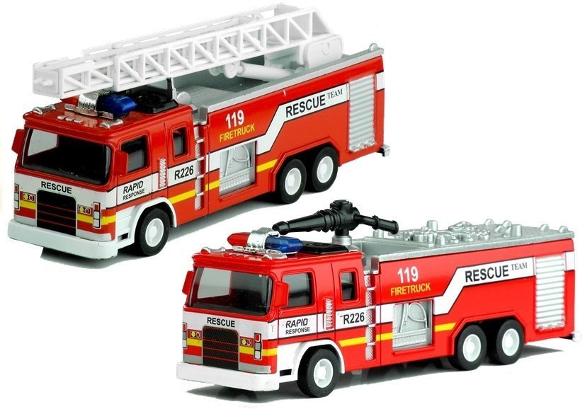Prezentowane wozy strażackie wykonano w skali 1:32. Ich wielkość umożliwia dokładne odwzorowanie rzeczywistego wozu strażackiego, a także zaznaczenie najważniejszych elementów jego wyposażenia. Napisy, niebieskie światła i detale, takie jak charakterystyczne dla tego typu pojazdów napisy, wskazują na wiele podobieństw z prawdziwymi maszynami. Autka wykonane są wysokogatunkowego materiału, który gwarantuje długą żywotność zabawki, a także solidność i przyjemność płynącą z użytkowania. Gumowane koła pojazdów są obrotowe, co pozwala na wesołą zabawę na różnych podłożach, natomiast główne elementy wyposażenia, takie jak armatka wodna lub drabina, są ruchome.
