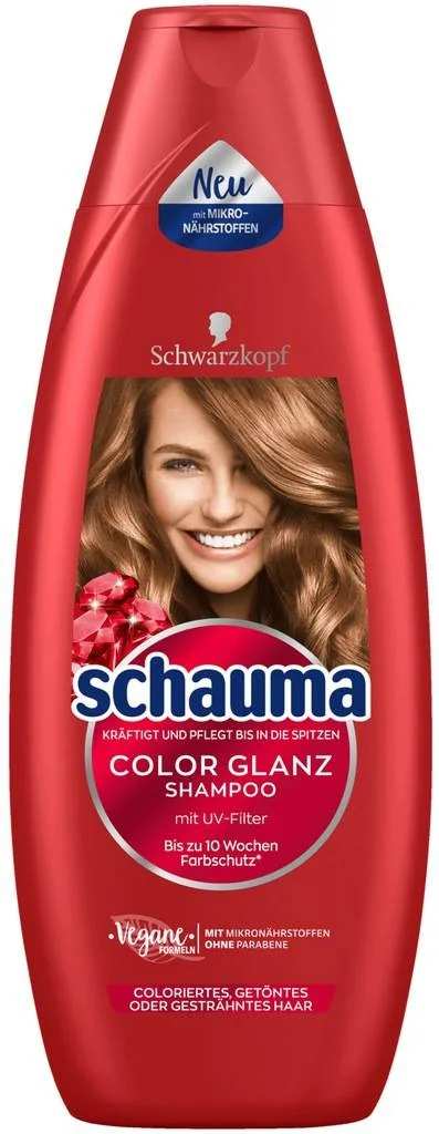 Szampon Schauma Color Glanz to doskonały wybór dla włosów farbowanych. Dzięki formule z ekstraktem z granatu, skutecznie pielęgnuje i chroni kolor, zapewniając mu długotrwały blask. Produkt ma pojemność 350 ml, co sprawia, że jest idealny do codziennego użytku.