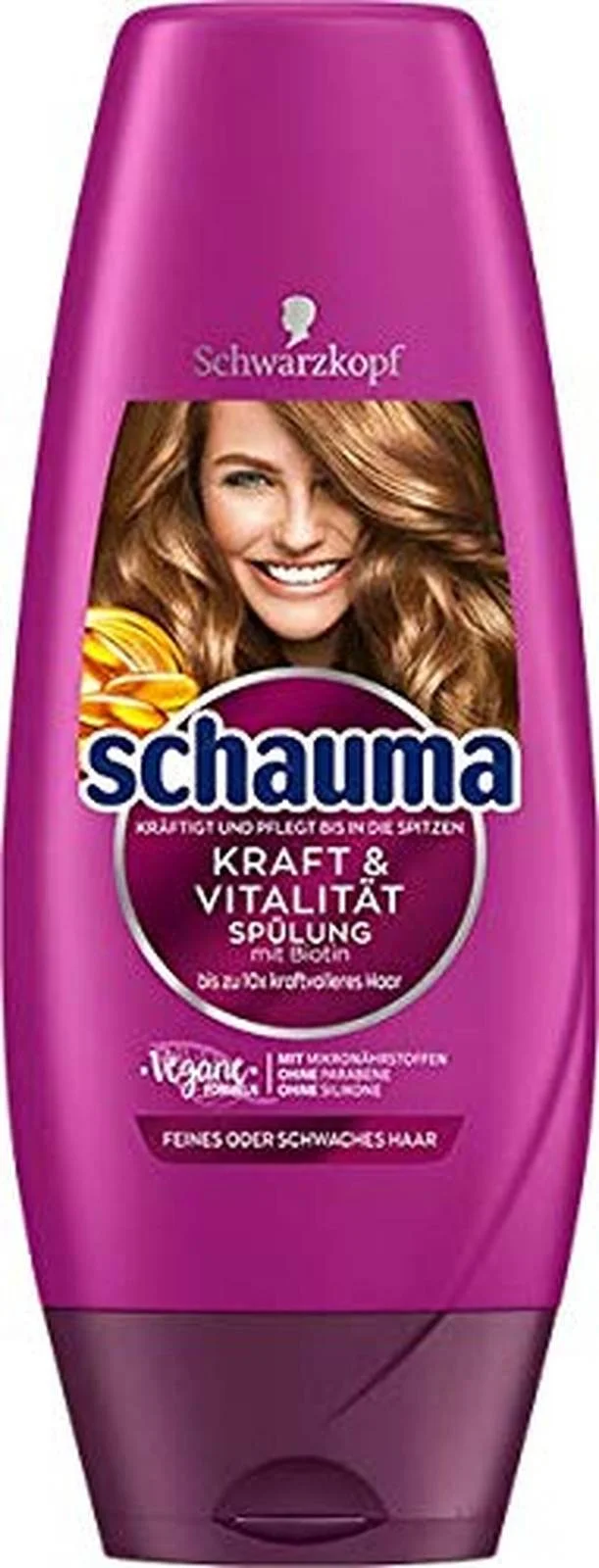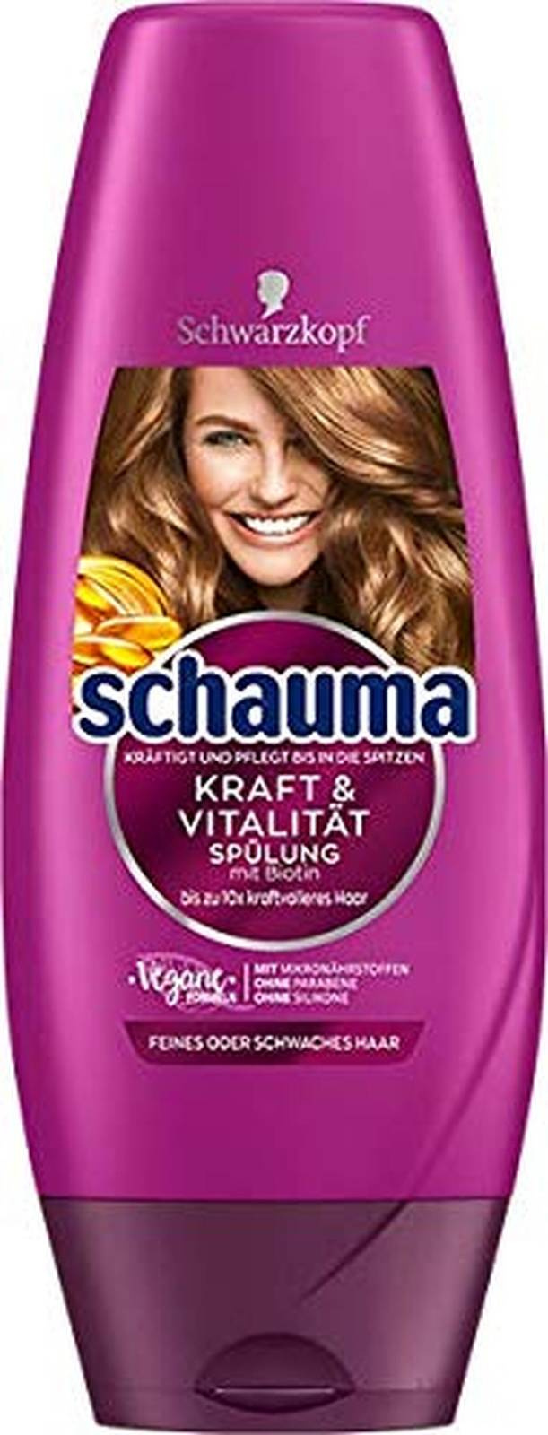 Odżywka do włosów Schauma Kraft&Vitalitat z biotyną skutecznie wzmacnia włosy, zapewniając im do 10 razy większą odporność na łamanie. Dzięki zastosowaniu kompleksu mikroelementów, w tym witamin, naturalnych protein i minerałów, włosy stają się mocne i zdrowe od nasady aż po końce.