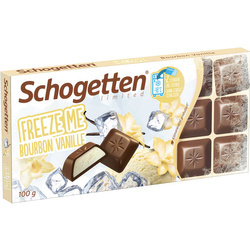 Schogetten Freeze Me Bourbon Vanille to wyjątkowy sposób na przygotowanie pysznych pralinek lodowych w zaledwie kilka chwil. Wystarczy umieścić baton w zamrażarce na 2 godziny, aby cieszyć się orzeźwiającym smakiem. Każdy kawałek pokryty jest najlepszą mleczną czekoladą, w której znajdziesz delikatny krem waniliowy. To słodka pokusa, która zadowoli nie tylko miłośników czekolady.
