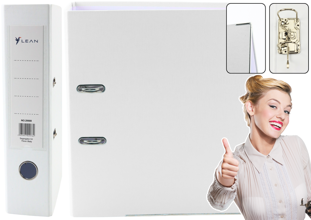 Segregator na dokumenty A4 z szerokim grzbietem 75 mm w eleganckim, czystym białym kolorze. Idealny do przechowywania dokumentów w biurze, domu oraz do organizacji materiałów szkolnych. Ten pojemny segregator mieści do 500 kartek (o gramaturze 80g/m²), co czyni go świetnym rozwiązaniem do archiwizacji faktur, umów, raportów i innych istotnych dokumentów. Wysoka jakość wykonania sprawia, że segregator jest niezawodny i trwały.