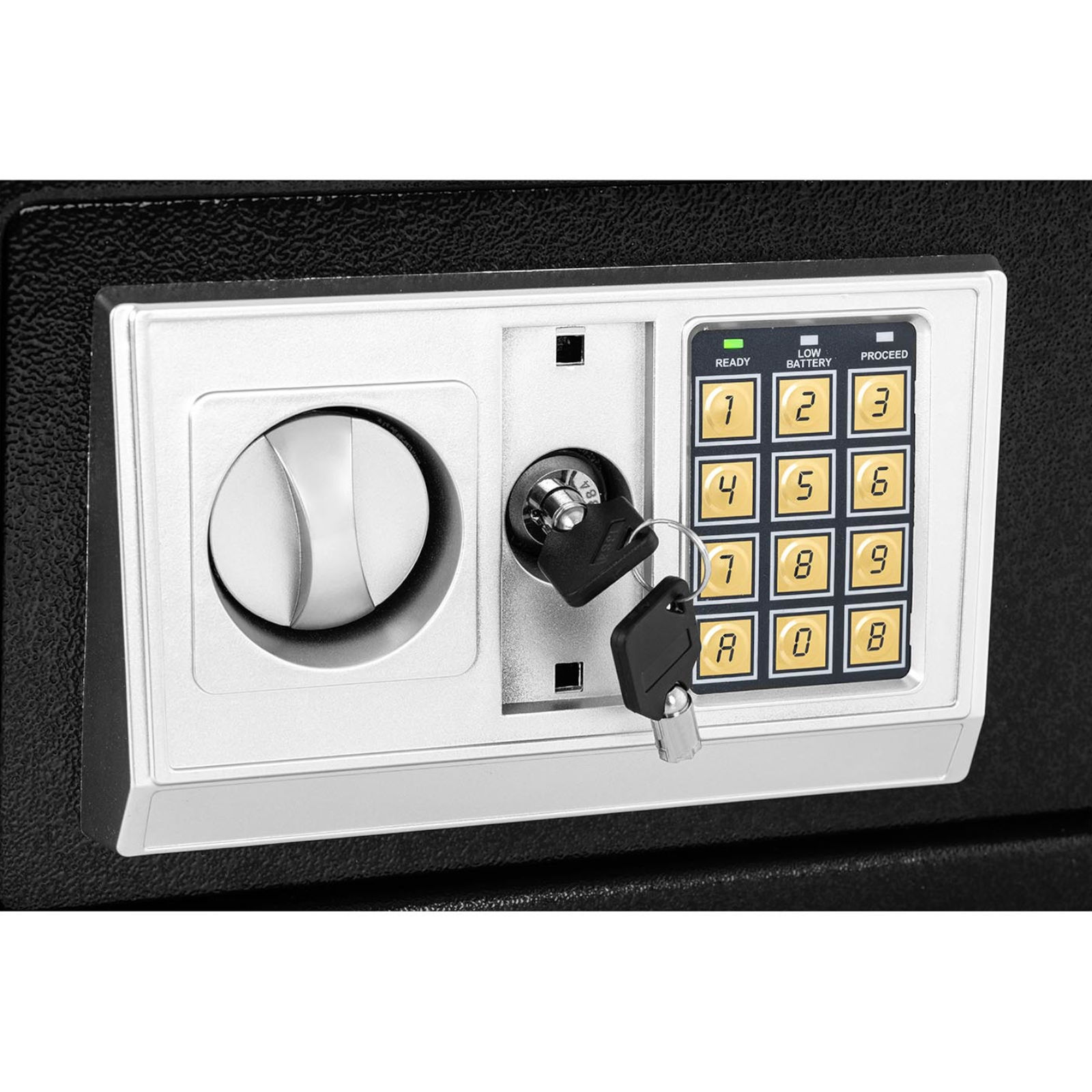 Produkt wyposażono w dwa zamki. Pierwszy to zamek elektroniczny, który można ustawić na kombinację od 3 do 8 cyfr, co pozwala na jego dowolną zmianę. Drugi zamek otwierany jest za pomocą kluczy, co jest pomocne w przypadku zapomnienia kodu. Sejf wykonano z solidnej stali stopowej malowanej proszkowo, co zapewnia mu wysoką wytrzymałość.