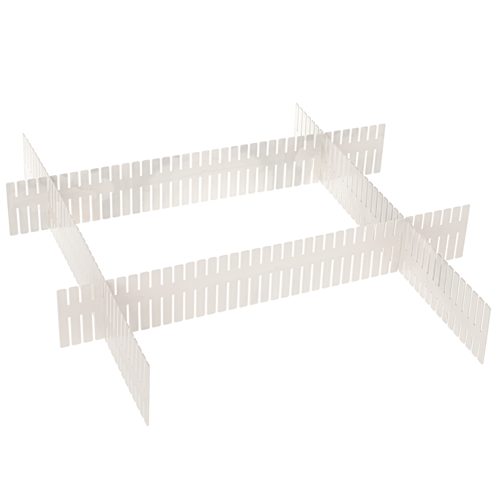 W zestawie znajdują się cztery sztuki separatorów, które można swobodnie przycinać do wymaganej długości. Montaż polega na wymierzeniu szuflady i dostosowaniu separatorów do jej wymiarów. Proste łączenie za pomocą otworów zapewnia stabilność całej konstrukcji.