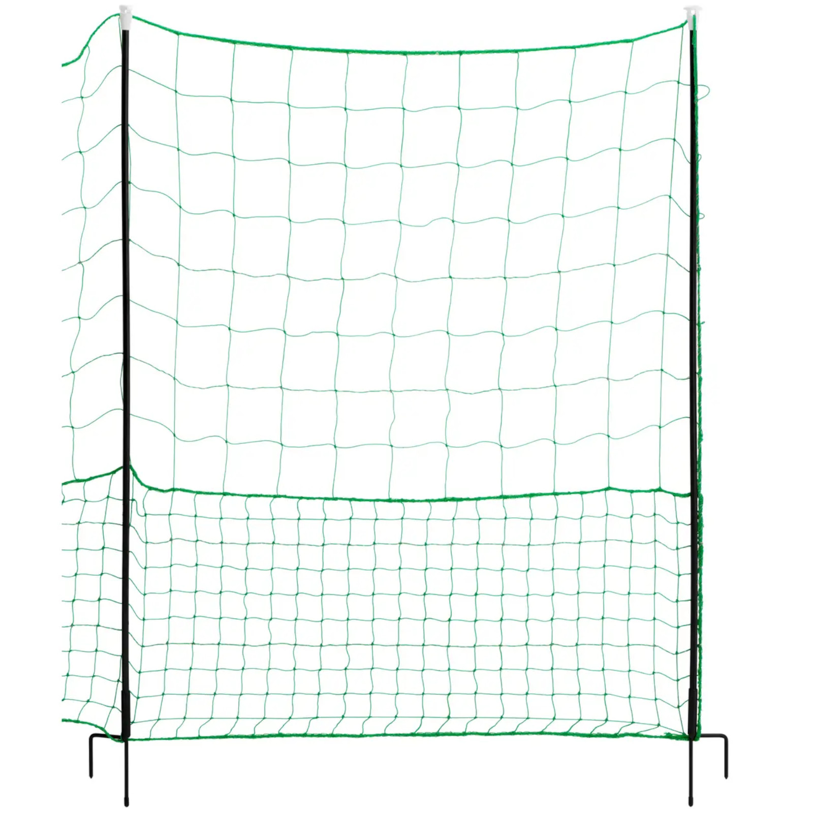 W zestawie znajduje się 7 tyczek z włókna szklanego, które pozwalają na łatwe ustawienie siatki. Słupki można mocno osadzić w ziemi za pomocą stalowych haków gruntowych, co zapewnia stabilność całej konstrukcji. Dzięki zintegrowanym ogranicznikom podłogowym drób nie ma możliwości ucieczki, a także zabezpiecza przed intruzami.