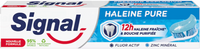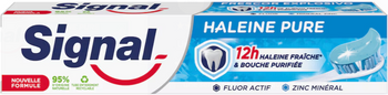 Pasta do zębów Signal Haleine Pure o pojemności 75 ml skutecznie eliminuje nieświeży oddech, atakując jego źródło. Dzięki aktywnemu fluorowi oraz innowacyjnej formule z fluorowanymi mikrosferami, pasta uwalnia heksedrynę o działaniu antybakteryjnym podczas szczotkowania. Efektem jest aż 12 godzin świeżego oddechu oraz dokładne oczyszczenie jamy ustnej.