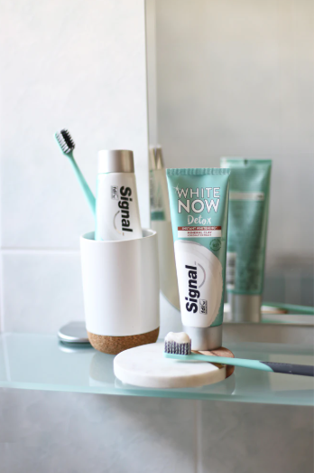 Signal White Now Detox Argile Minérale & Coco pasta do zębów łącząca skuteczność wybielania z działaniem oczyszczającym. Dzięki zawartości glinki mineralnej i naturalnego ekstraktu z kokosa skutecznie usuwa przebarwienia, jednocześnie wspierając codzienną pielęgnację jamy ustnej.
