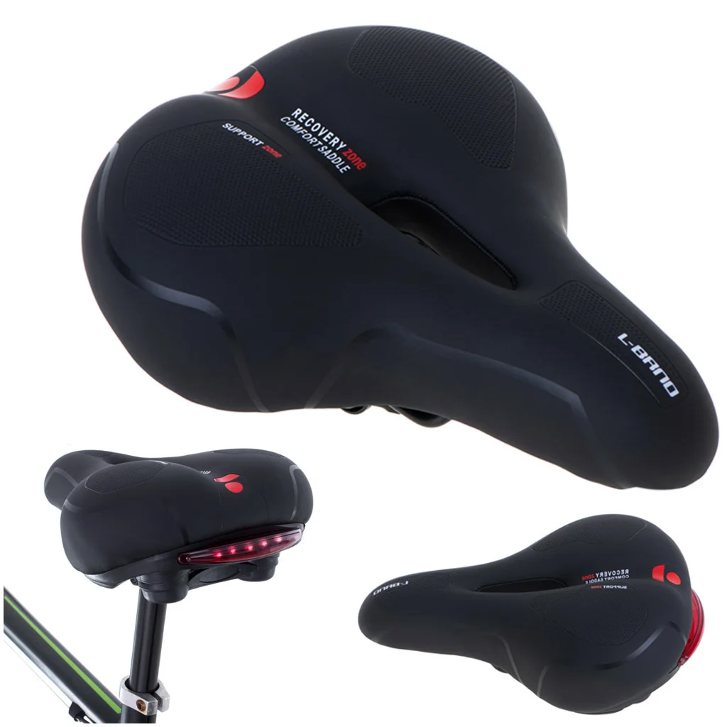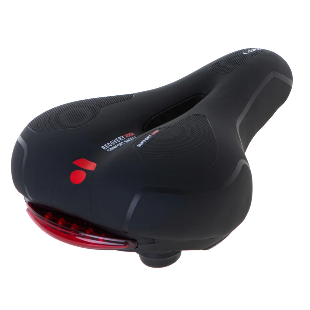 Anatomiczne wycięcie w centralnej części siodełka redukuje ucisk, co jest szczególnie istotne podczas długich jazd. Siodełko waży jedynie 0.880 kg, co nie obciąża roweru. Dodatkowo, wbudowana lampka LED zwiększa widoczność po zmroku, co jest kluczowe dla bezpieczeństwa każdego rowerzysty.