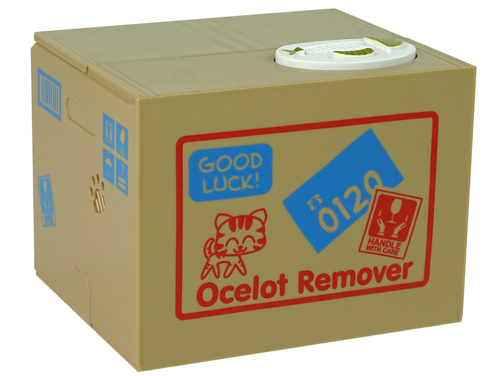 Naciśnij przycisk na budce a kot dźwignie pokrywkę i łapką wciągnie pieniążka.