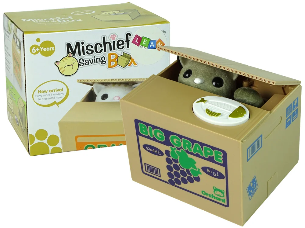 Naciśnij przycisk na budce a kot dźwignie pokrywkę i łapką wciągnie pieniążka.