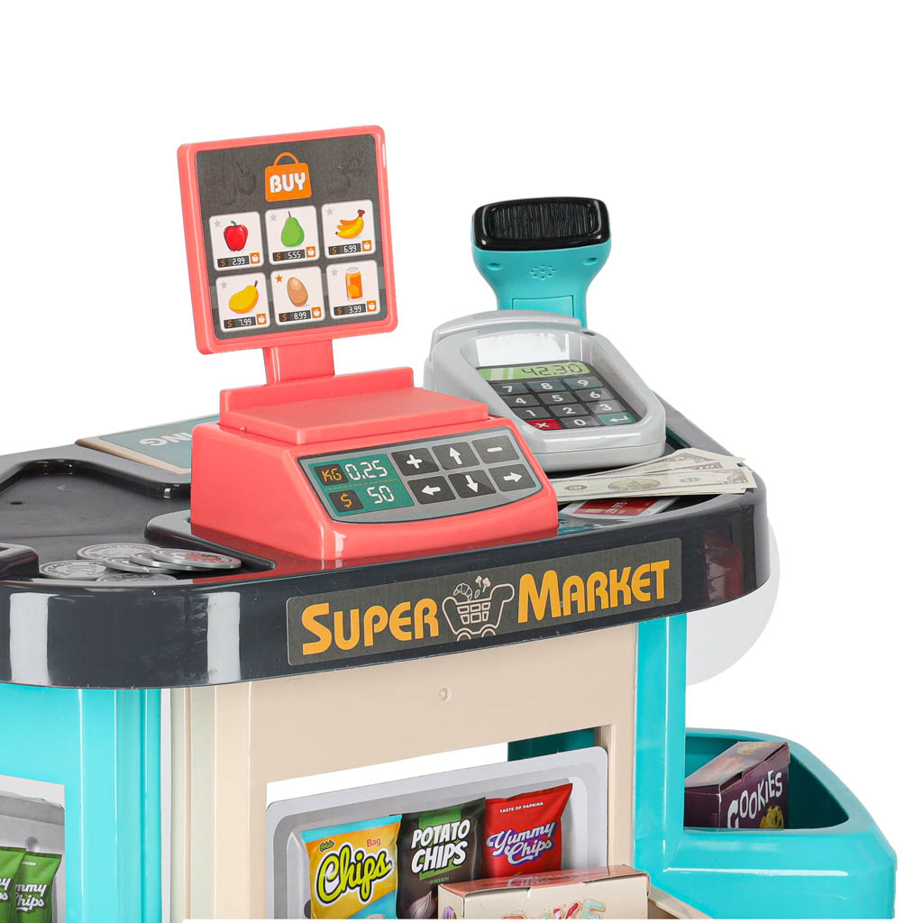 W skład zestawu wchodzi 47 elementów, które pozwolą stworzyć prawdziwy sklep spożywczy. Wśród akcesoriów znajdują się plastikowe owoce, warzywa, jajka oraz kartonowe opakowania różnych produktów, takich jak ciastka czy soki. Dodatkowo, zestaw zawiera terminal płatniczy i skaner kodów kreskowych, które emitują dźwięki przypominające prawdziwe urządzenia.
