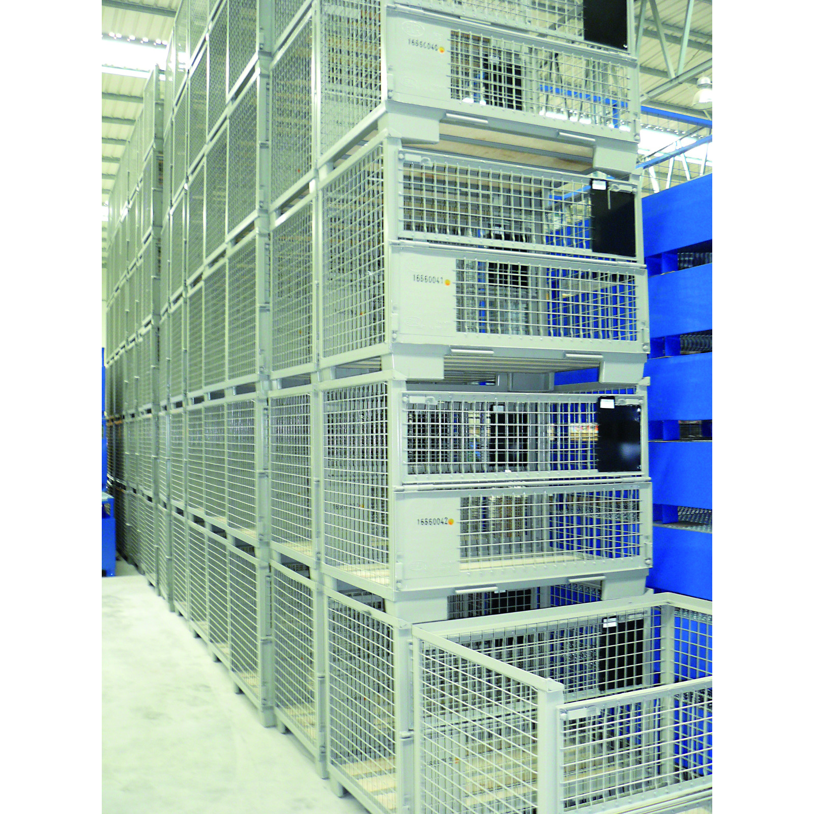 Skrzynia charakteryzuje się solidną konstrukcją, która obejmuje wytrzymałą ramę podłogową oraz ściany boczne z grubej siatki. Otwierany panel boczny zapewnia łatwy dostęp do wnętrza skrzyniopalety.