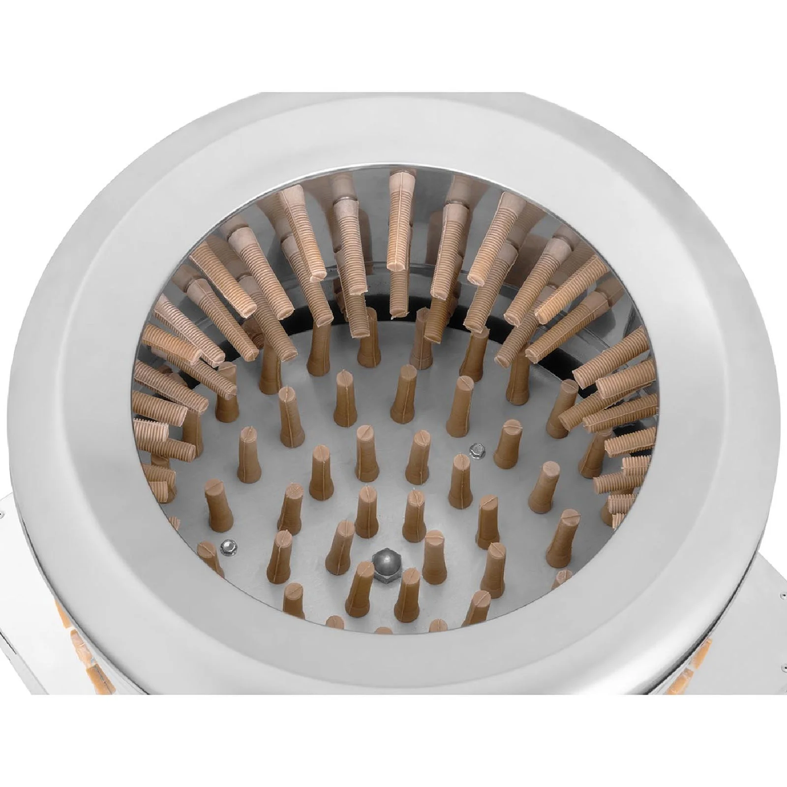 Maszyna została wyposażona w 131 gumowych wypustek, które skutecznie usuwają pióra przy prędkości 1400 obrotów na minutę, minimalizując ryzyko uszkodzenia skóry drobiu.