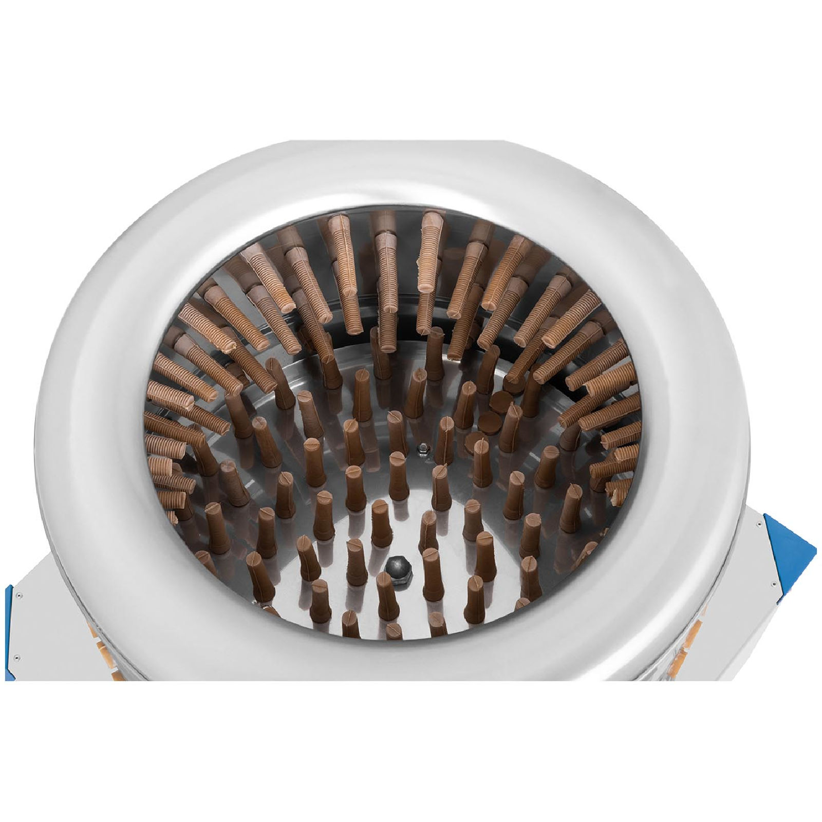Maszyna skubiąca charakteryzuje się prędkością obrotową wynoszącą 275 obr./min. Dodatkowo, 181 gumowych wypustek zapewnia bezpieczne usuwanie piór, minimalizując ryzyko uszkodzenia skóry ptaków. Czas skubania dwóch kurczaków wynosi jedynie 18 sekund, co znacznie zwiększa efektywność pracy.