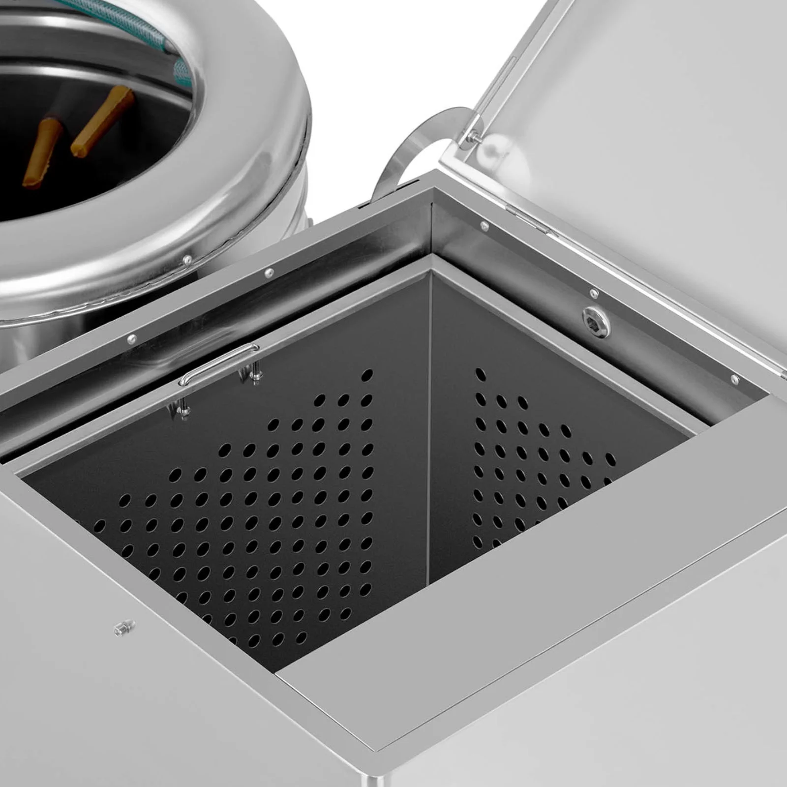 Maszyna wykonana jest ze stali nierdzewnej, co zapewnia jej długotrwałość i łatwość w czyszczeniu. Dodatkowo, skubarka posiada rynnę spływową oraz 4 kółka, co ułatwia transport i obsługę.