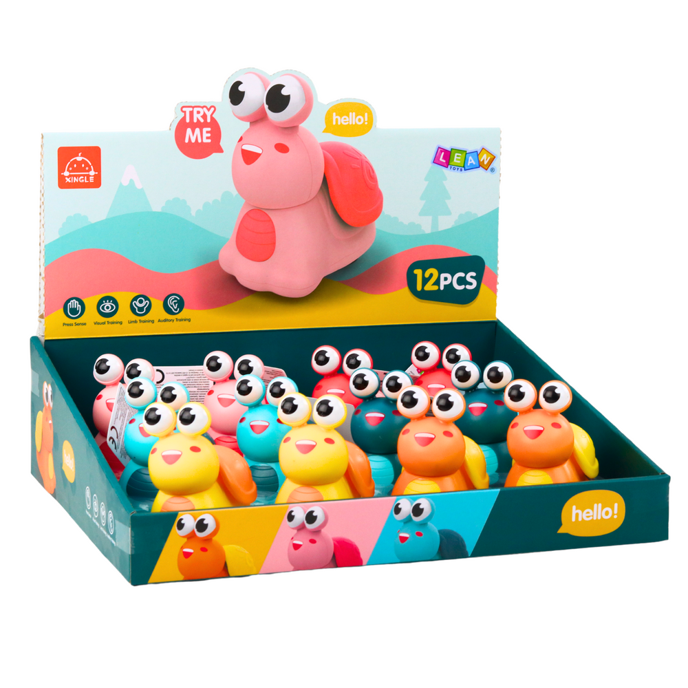 Duże oczy, wesoły wyraz twarzy oraz pastelowe kolory sprawiają, że ślimak szybko staje się ulubionym towarzyszem zabaw. Jego kształt został zaprojektowany z myślą o małych rączkach – jest lekki, bezpieczny i łatwy do chwytania. Dzięki temu dzieci z łatwością mogą samodzielnie wprawić go w ruch.