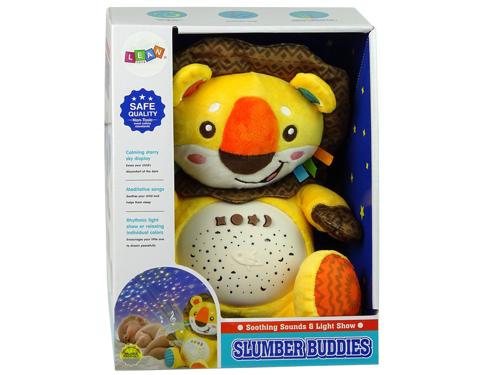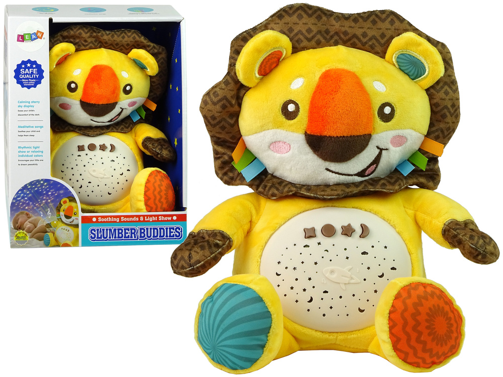 Lew posiada wbudowany projektor, który wyświetla na ścianach lub suficie zmieniające kolory gwiazdki. Wieczorem stworzy harmonie i magiczny nastrój w pokoju Twojego dziecka. Pluszowy projektor gwiazdek z pozytywką jest zabawką przeznaczoną dla dzieci w każdym wieku.