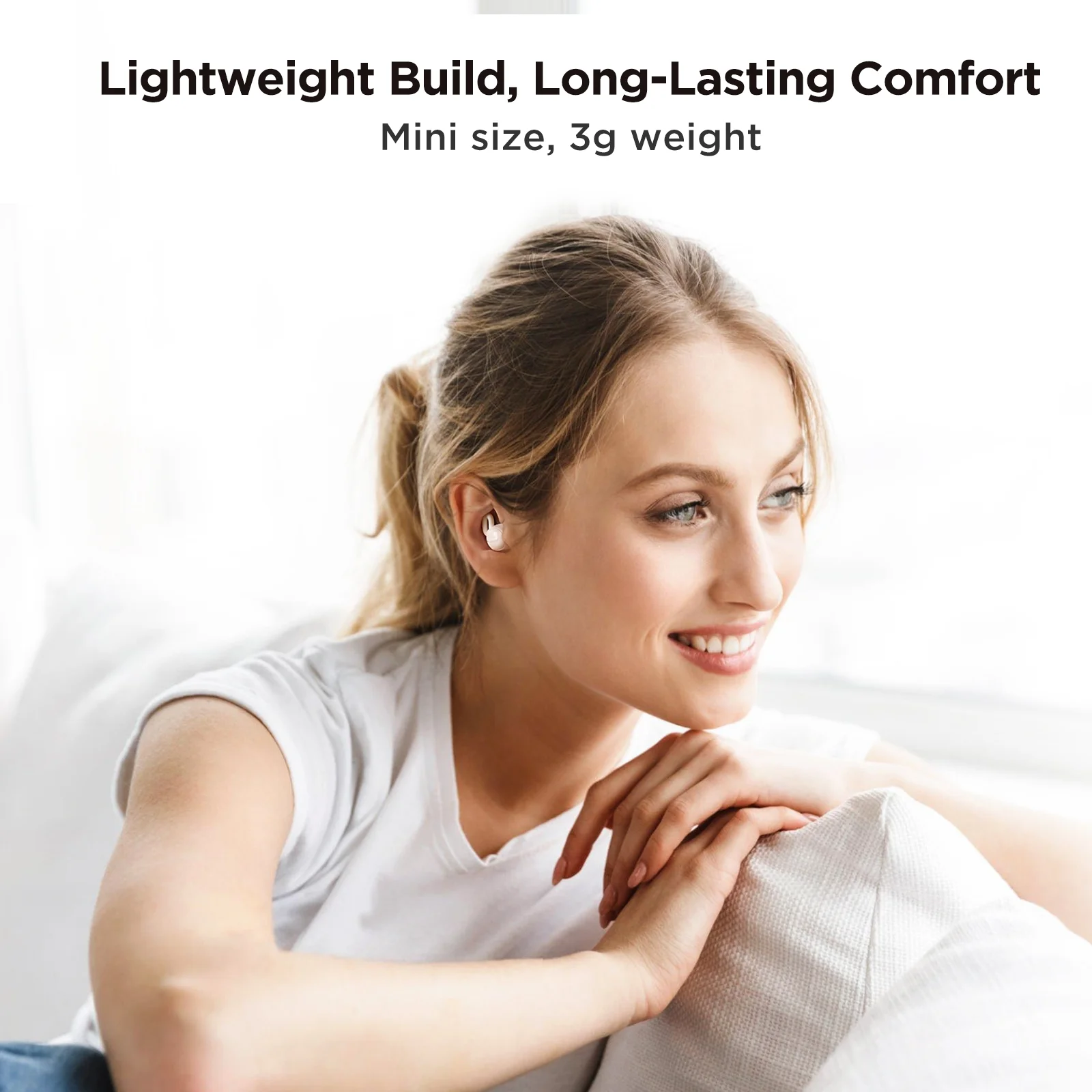 Ultrakompaktowa konstrukcja oraz silikonowe nauszniki gwarantują komfort noszenia przez całą noc, nawet w trakcie snu na boku. Miękki materiał idealnie dopasowuje się do kształtu ucha, co umożliwia długotrwałe użytkowanie bez uczucia dyskomfortu.