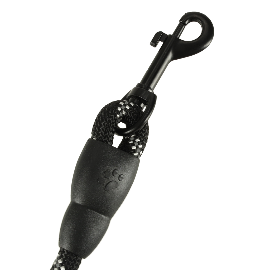 Wytrzymały sznur i chromowany karabińczyk są wystarczająco mocne, aby utrzymać średnie i większe rasy psów.