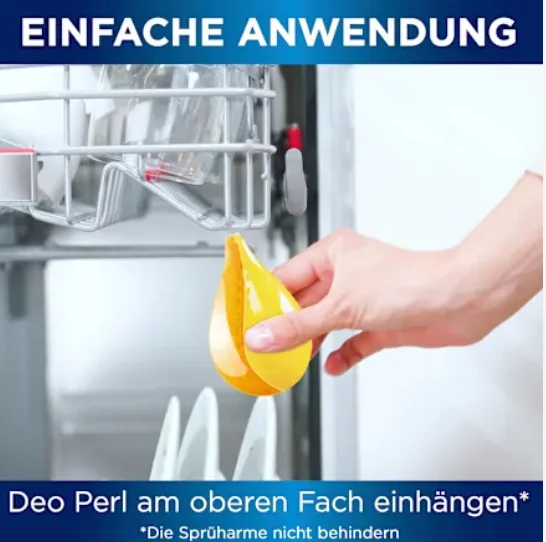 Sposób stosowania: Wyjmij Somat Deo Duo-Perls z opakowania. Przymocuj obudowę dezodorantu do górnego stojaka na naczynia, aby ramiona spryskujące nie były zasłonięte.