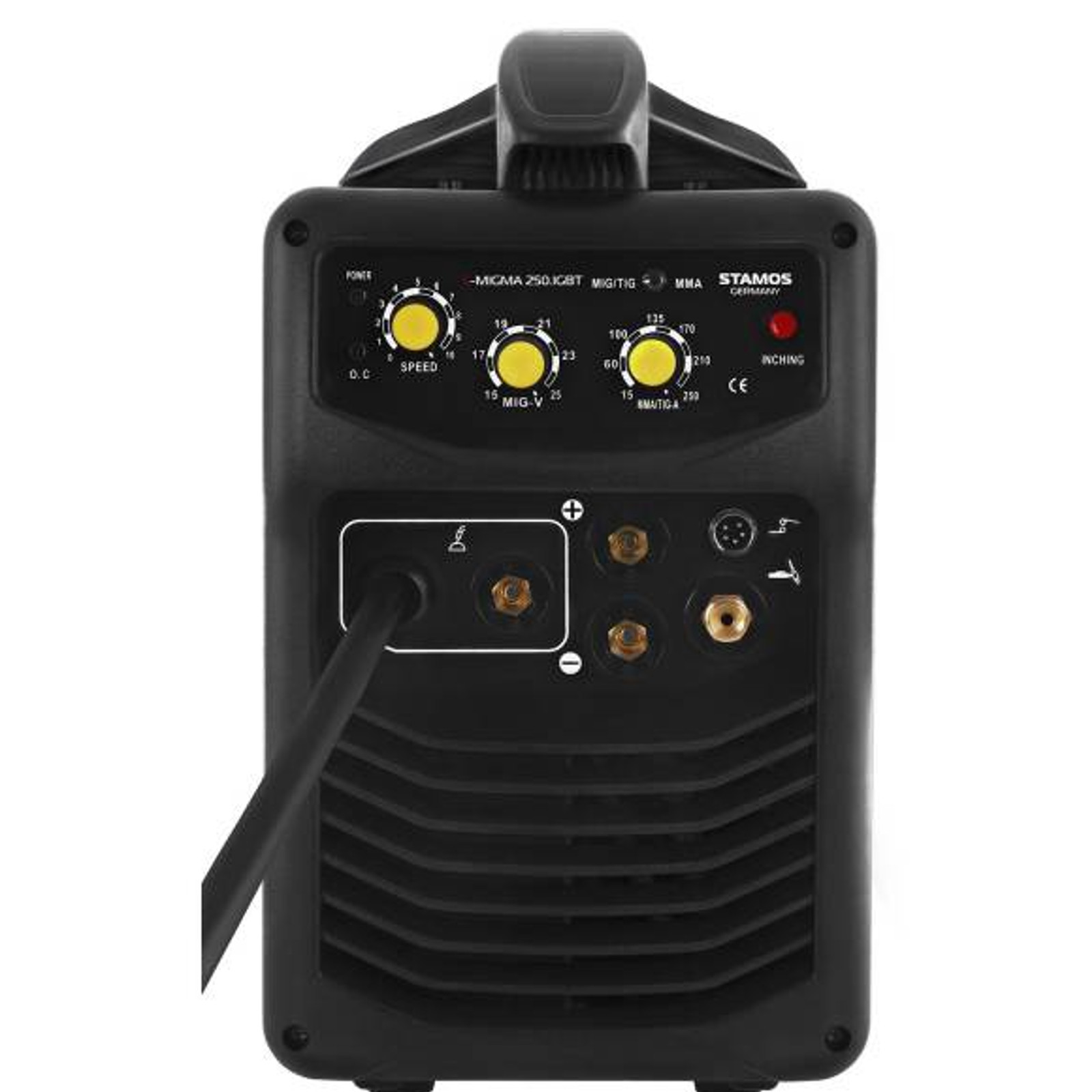 Urządzenie posiada bezstopniową regulację prądu spawania, osiągającą maksymalnie 250 A, co pozwala na precyzyjne dostosowanie ustawień do indywidualnych potrzeb.
