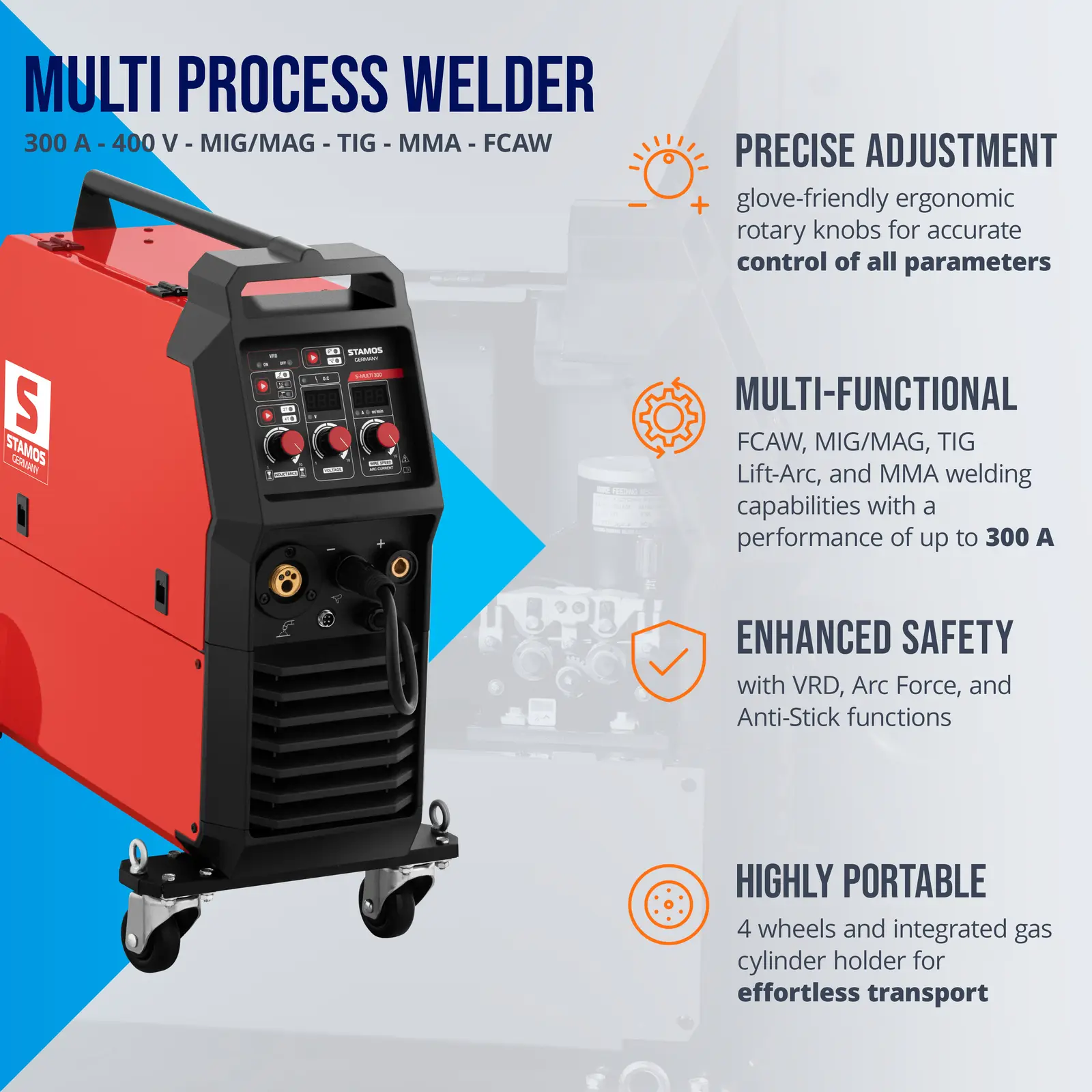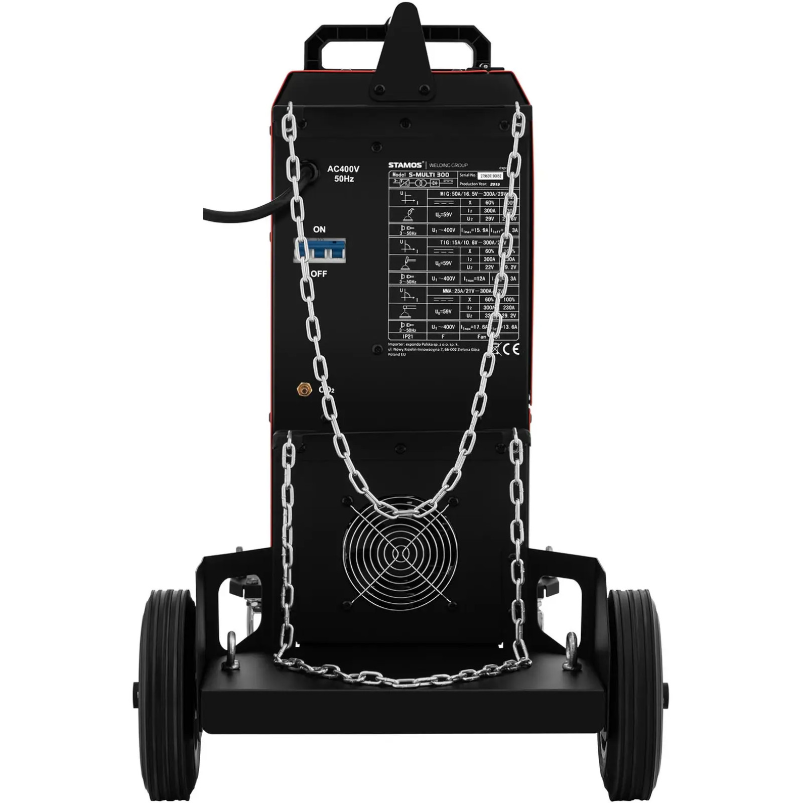 Transport ułatwia wózek oraz miejsce na butlę gazową, co zapewnia bezpieczeństwo w trakcie przemieszczania. Czytelny panel sterowania z dwoma wyświetlaczami pozwala na monitorowanie parametrów spawania, w tym prądu do 300 A, co gwarantuje kontrolę nad procesem.
