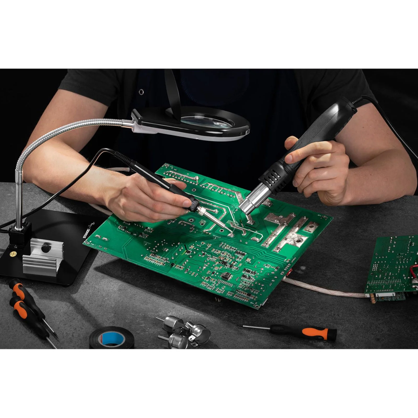 Stacja lutownicza S-LS-4 to funkcjonalne urządzenie, które łączy lutownicę grotową oraz moduł HOT AIR. Jest idealna do profesjonalnych prac lutowniczych z różnymi układami elektronicznymi. Dzięki cyfrowemu sterowaniu, umożliwia precyzyjne kontrolowanie temperatury, co znacząco podnosi komfort pracy.