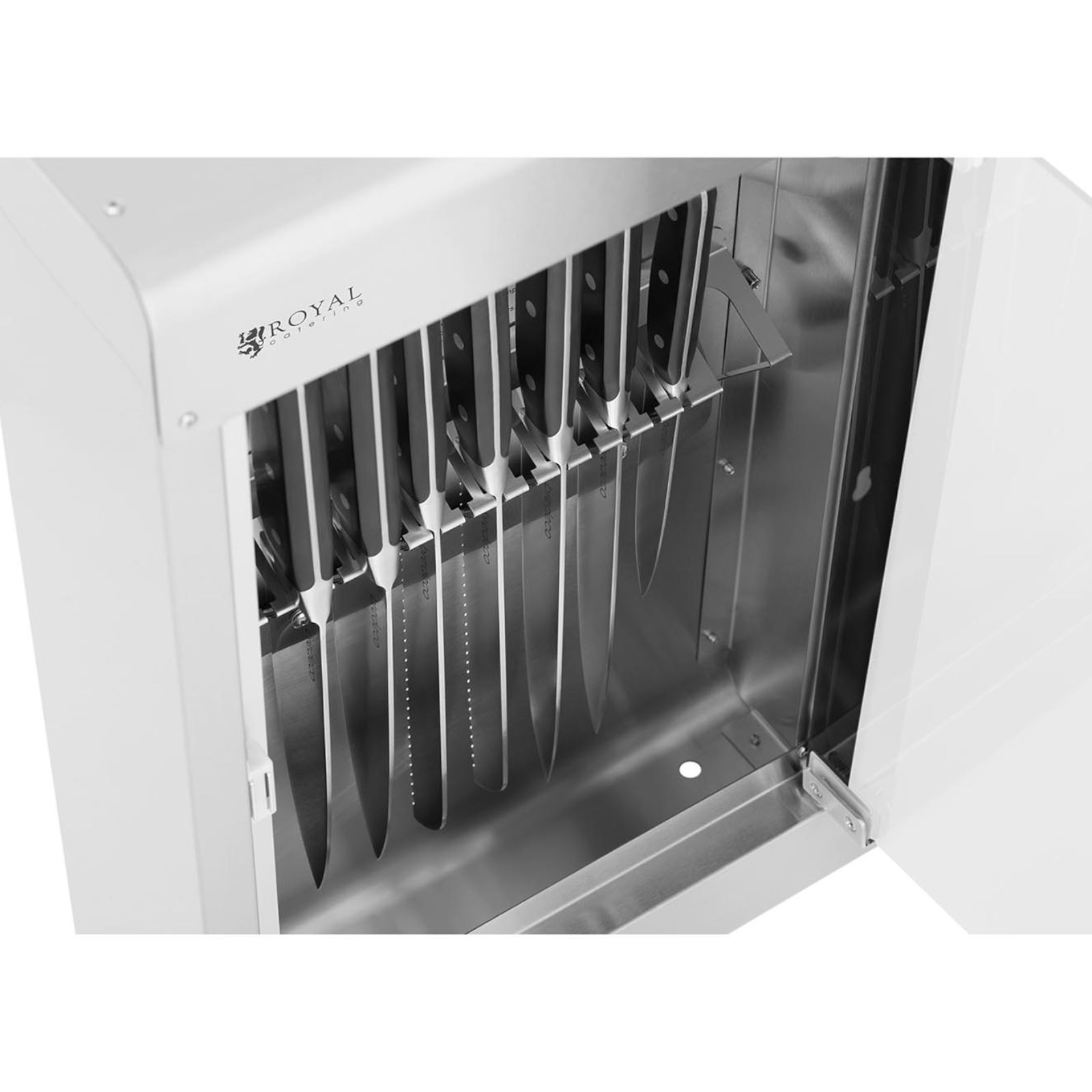 Urządzenie zostało wykonane z wytrzymałej stali nierdzewnej i ma pojemność na 14 noży. Drzwiczki z pleksiglasu zapewniają bezpieczeństwo, a dodatkowy filtr zwiększa efektywność działania.