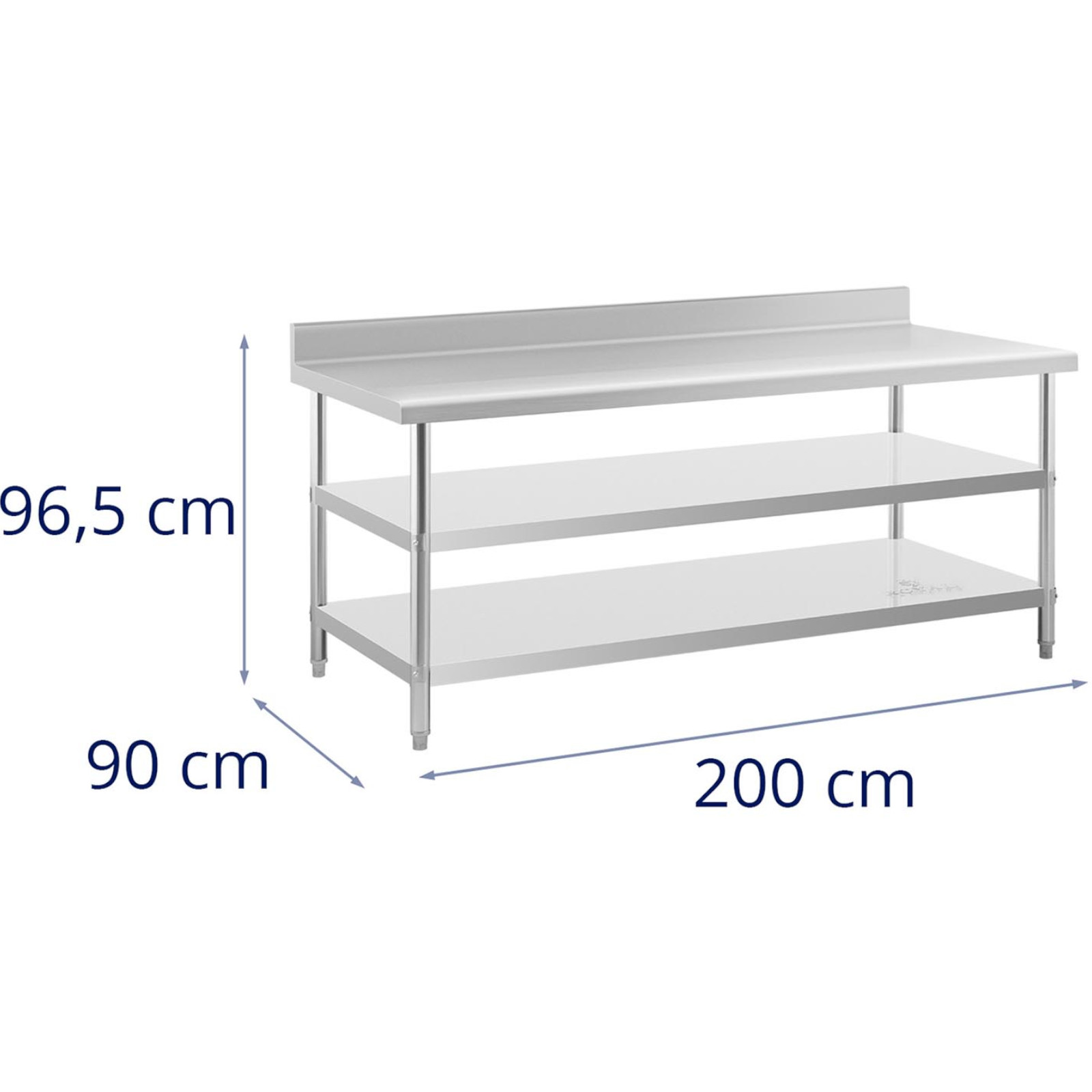 Stół marki Royal Catering to doskonały wybór do profesjonalnych kuchni. Jego solidna konstrukcja oraz przestronny blat o wymiarach 200 x 90 x 16.5 cm zapewniają wygodę podczas pracy. Dodatkowo, stół wyposażony jest w dwie półki, co umożliwia efektywne przechowywanie akcesoriów kuchennych.