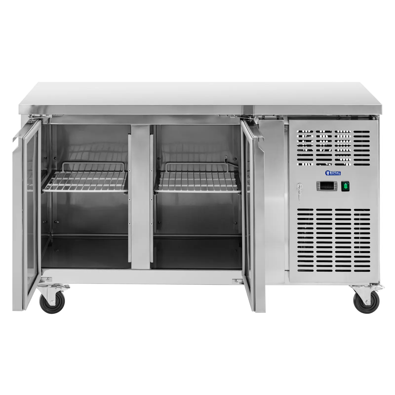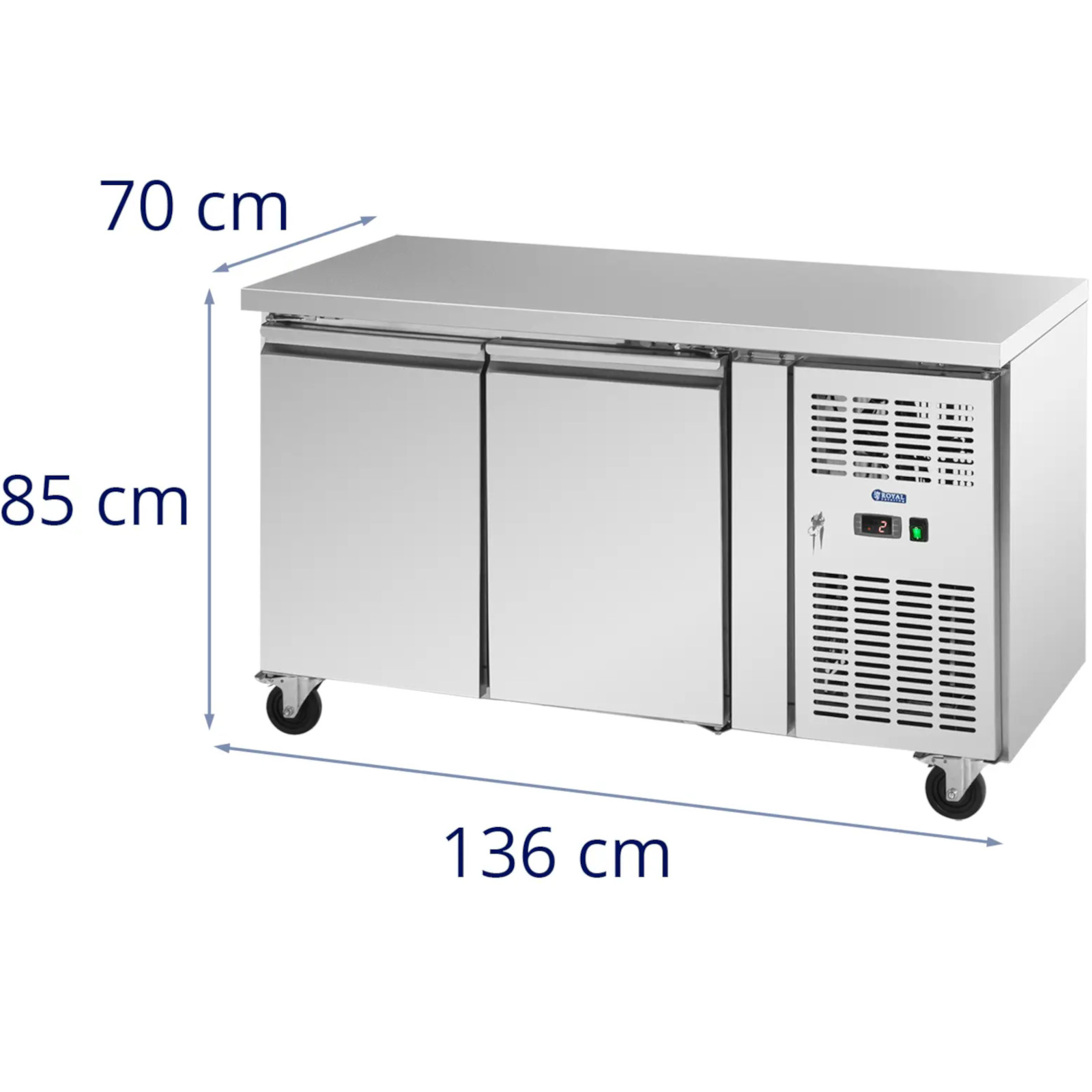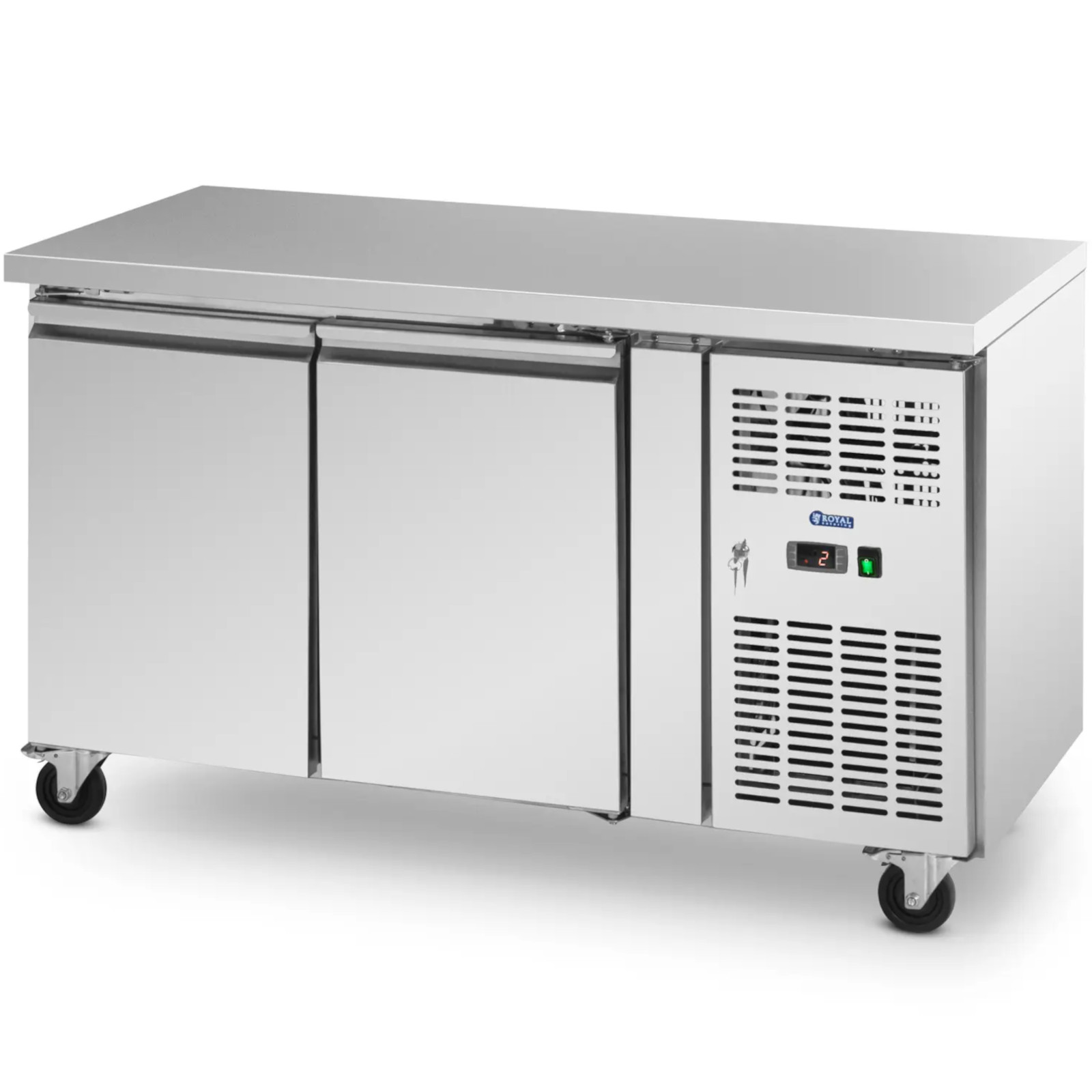 Stół chłodniczy marki Royal Catering to idealne rozwiązanie dla restauracji, kawiarni i barów. Dzięki dużej pojemności 260 litrów oraz blatu roboczemu o wymiarach 136 x 70 cm, zapewnia wygodę i funkcjonalność w kuchni. Urządzenie umożliwia łatwe przemieszczanie dzięki czterem kołom, z czego dwa posiadają hamulce, co gwarantuje stabilność podczas pracy.