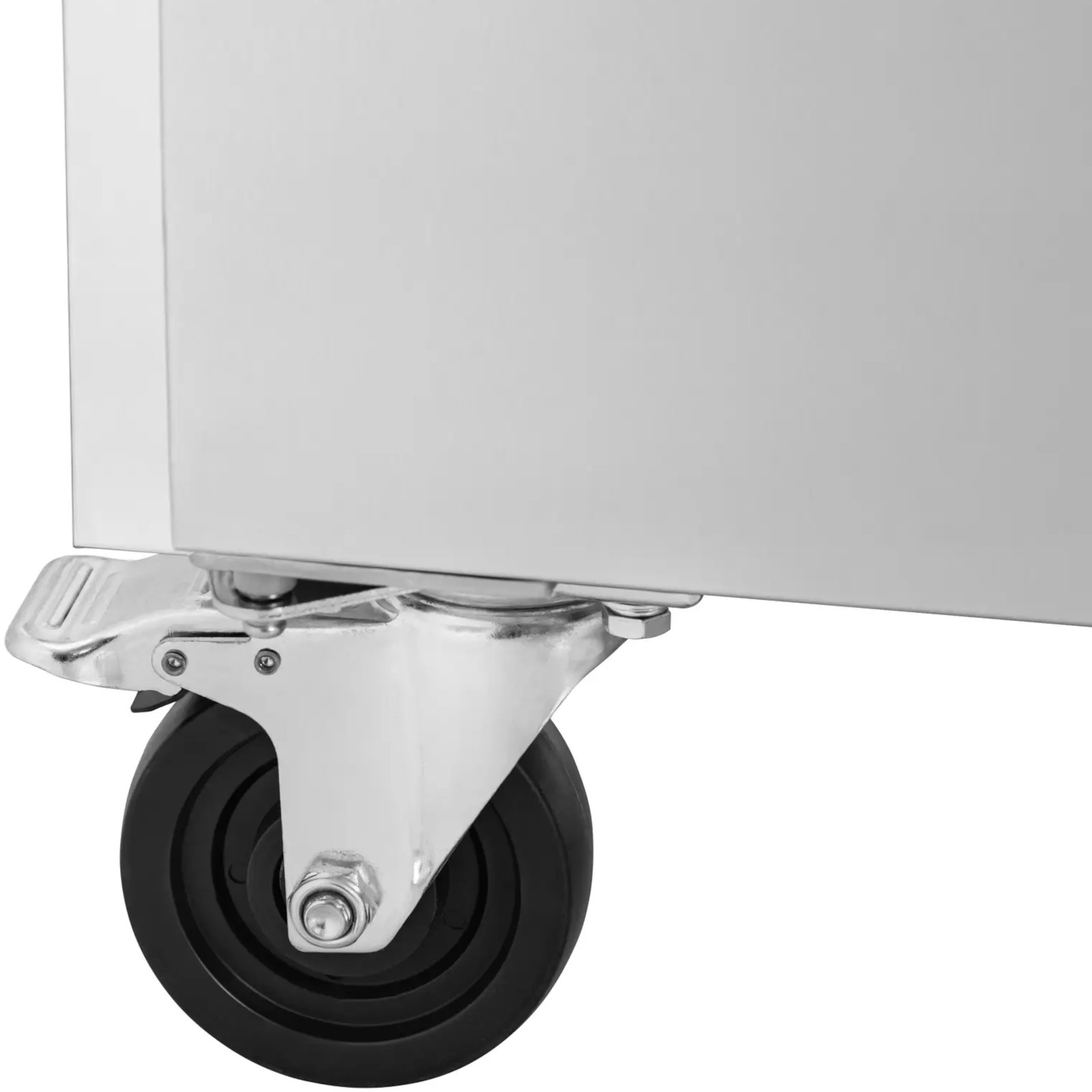 Obudowa stołu wykonana jest z wysokiej jakości stali nierdzewnej, co zapewnia trwałość i odporność na korozję. Dzięki niskiej porowatości materiału, stół łatwo się czyści, co jest istotne w intensywnie eksploatowanych kuchniach. Dwie przestronne komory z regulowanymi półkami zapewniają elastyczność w organizacji przestrzeni.