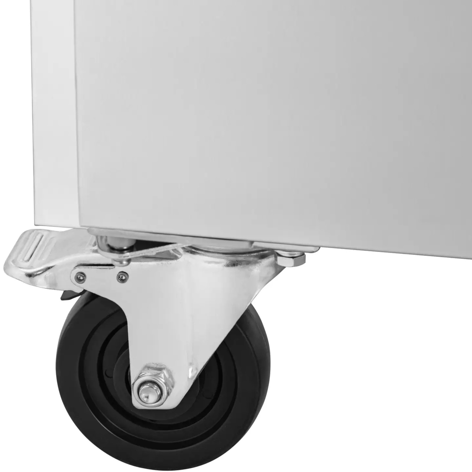 Urządzenie jest proste w przemieszczaniu dzięki czterem wytrzymałym kółkom, z których dwa są wyposażone w hamulce dla większego bezpieczeństwa. Stół chłodniczy ma zakres chłodzenia od 2 do 8 °C, co można łatwo ustawić na cyfrowym panelu sterowania. Klasa efektywności energetycznej B oraz zastosowanie czynnika chłodniczego R290 czynią go ekonomicznym wyborem.