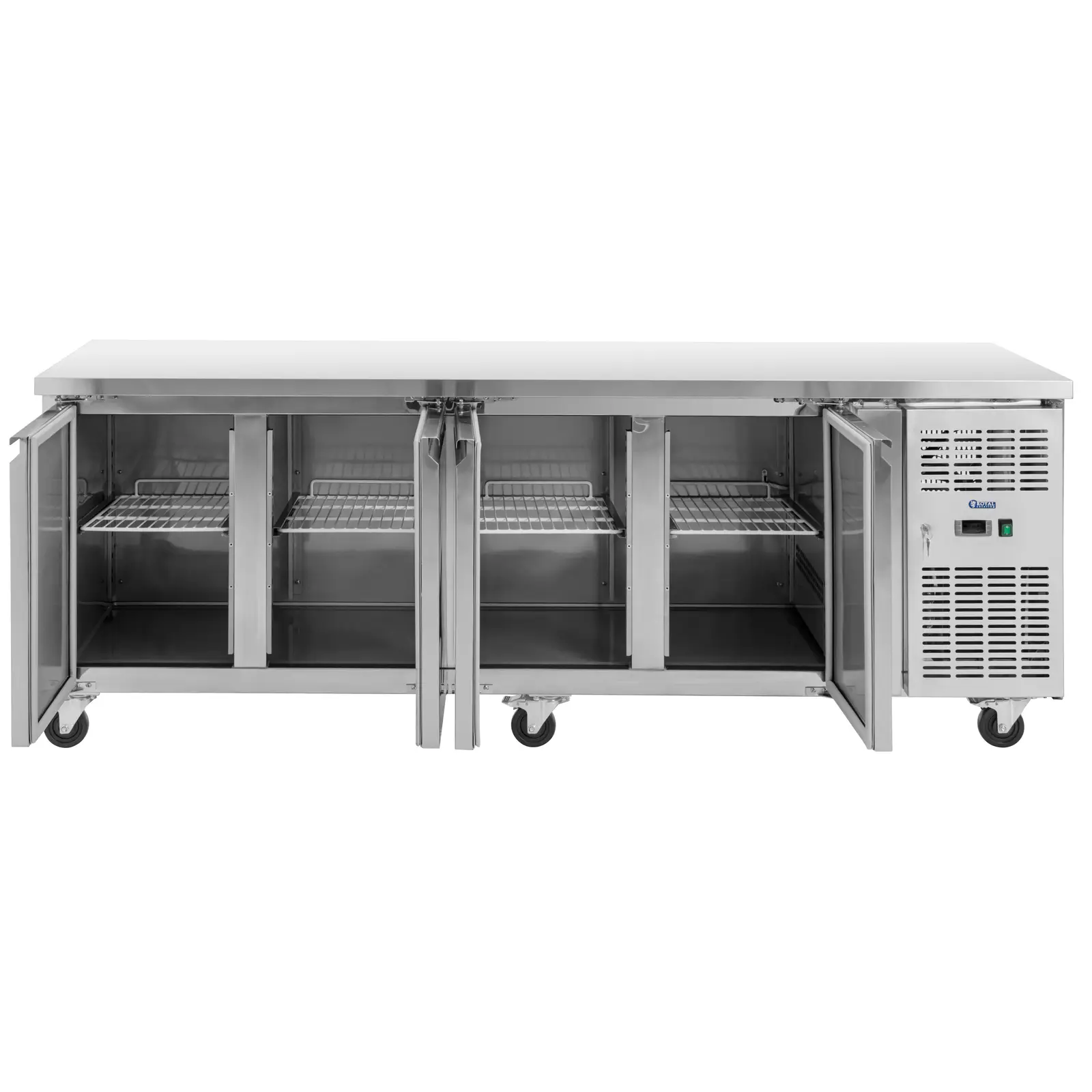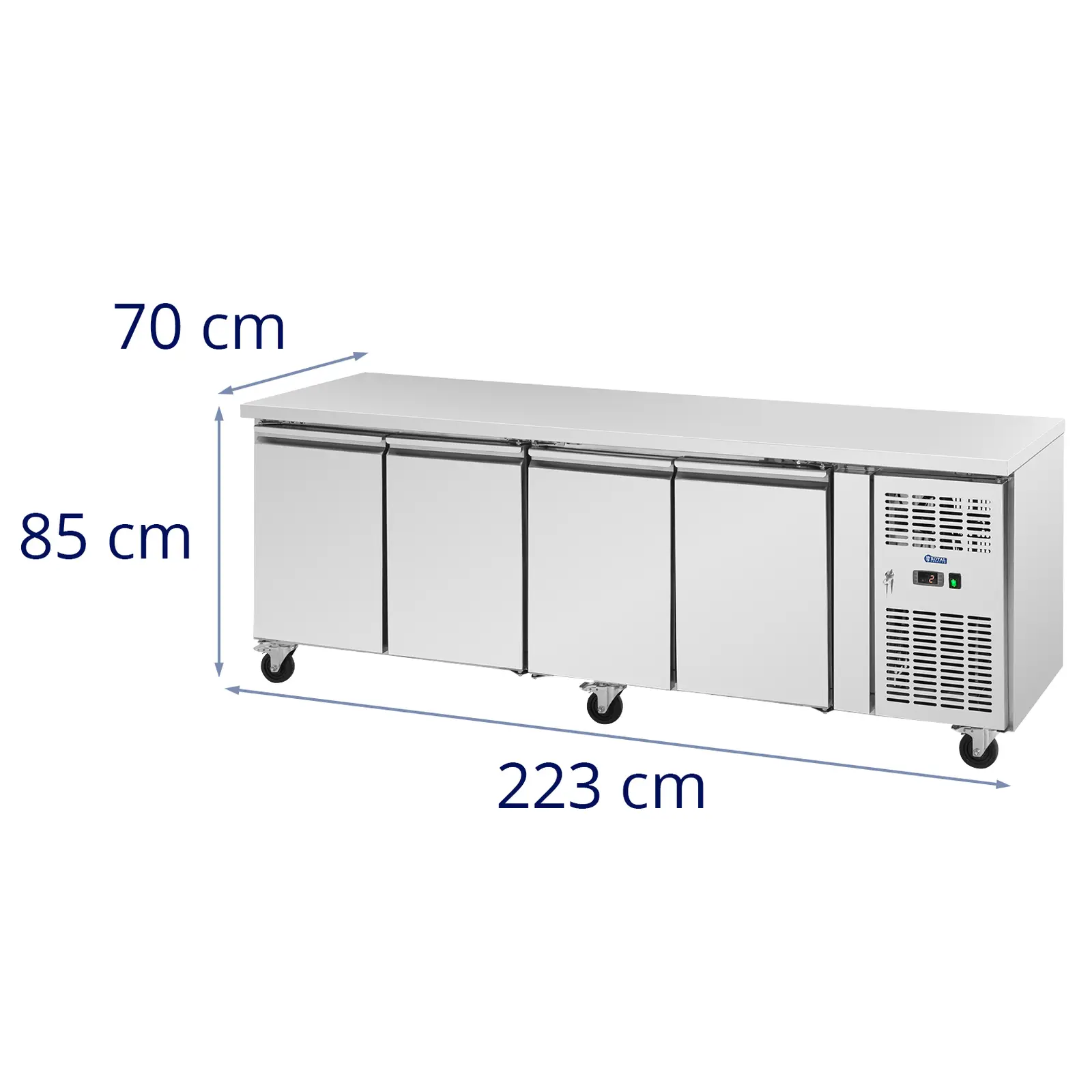 Izolacja o grubości 6 cm zapewnia stabilną temperaturę wewnątrz, a funkcja automatycznego odmrażania zmniejsza koszty energii. Blat roboczy o wymiarach 223 x 70 cm umożliwia wygodne przygotowywanie potraw. Obudowa ze stali nierdzewnej jest odporna na korozję i łatwa w czyszczeniu, co jest istotne w intensywnie użytkowanej kuchni.