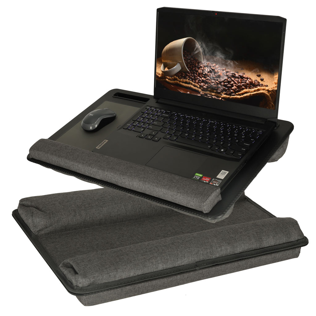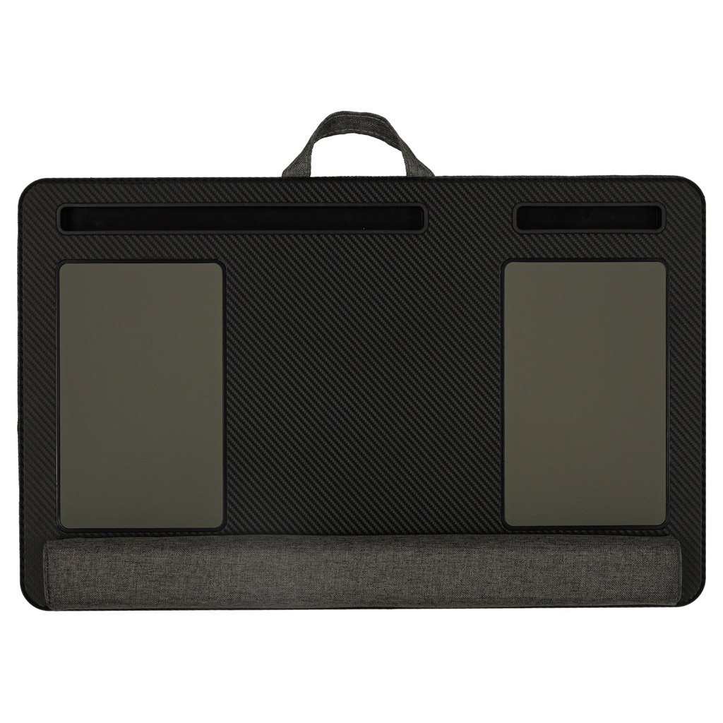 Wykonany z wysokiej jakości materiałów, stolik zapewnia trwałość i stabilność. Miękka poduszka podtrzymująca gwarantuje komfort, a boczne panele umożliwiają wygodne korzystanie z myszki, zarówno dla osób prawo- jak i leworęcznych. To doskonały wybór dla tych, którzy szukają mobilności bez rezygnacji z funkcjonalności, jaką oferuje tradycyjne biurko.