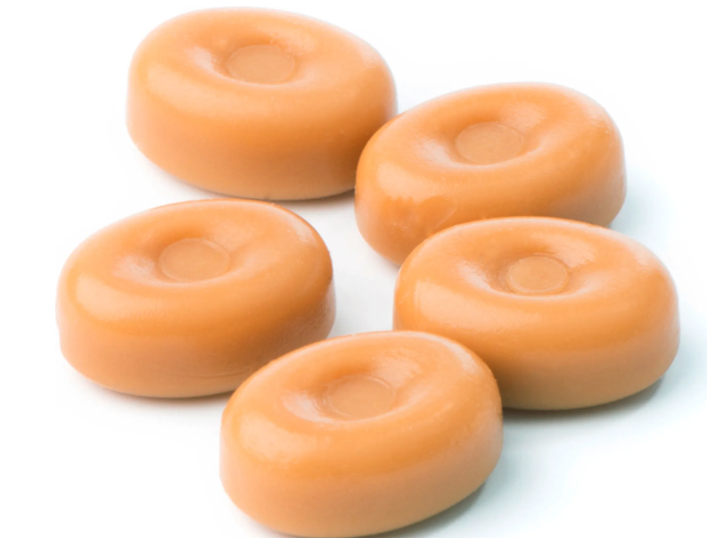 Składniki:Substancja słodząca izomalt, MASŁO (7,9%), MĄKA (7%), sól, aromaty, emulgator lecytyny (SOYA), substancja słodząca acesulfam K.