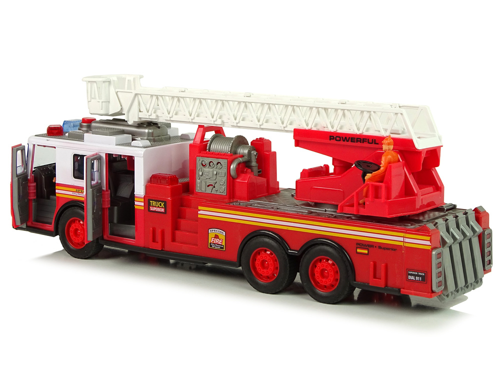 Czerwony wóz strażacki posiada regulowaną drabinę, którą można poruszać w górę i w dół, a także wydłużać ją i skracać. Poza tym można ją obrócić w każdą stronę, co umożliwi dostęp do większości miejsc, a jej zasięg to max 50 cm w górę. Na dole drabiny znajduje się platforma, którą może zająć figurka strażaka i sterować nią za pomocą kierownicy. Wóz wyposażony jest także w efekty świetlne i dźwiękowe. Przednie światła oraz górne koguty świecą, co umożliwia spostrzeżenie wozu z daleka. Straż posiada frykcyjny napęd tylnej osi na popych, wystarczy nacisnąć na tył, puścić do przodu i cieszyć się prędkością.