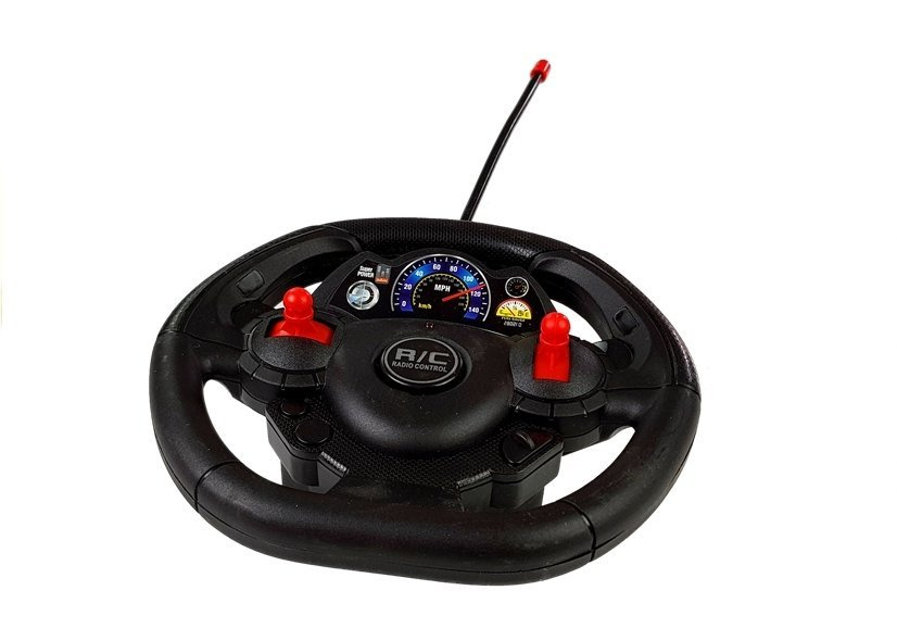 Możliwość obsługi pojazdu pilotem pozwala na jazdę przód/tył i prawo/lewo, a kształt przypominający kierownicę idealnie dopasuje się do małych rączek naszego młodego operatora wozu strażackiego.