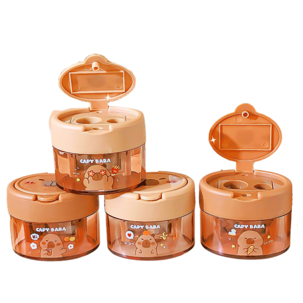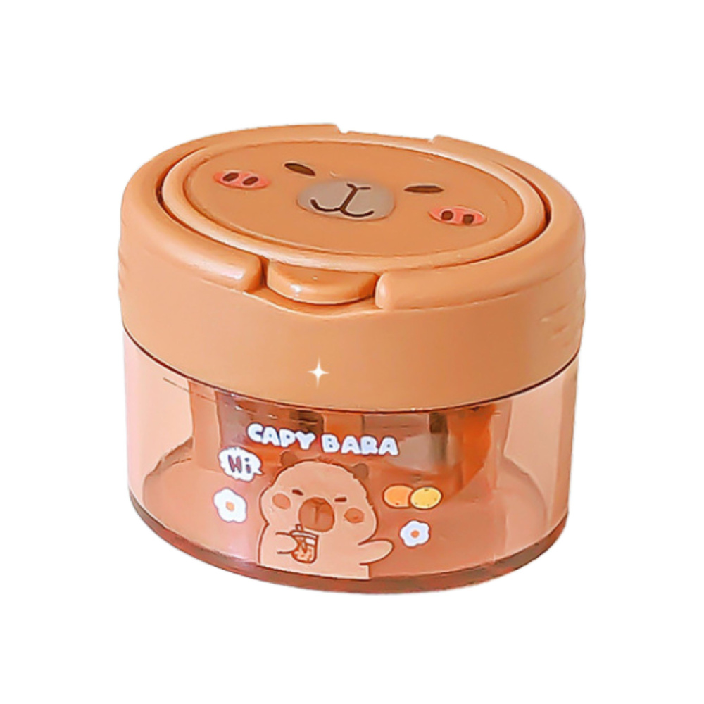 Obudowa w ciepłym, karmelowym kolorze ozdobiona jest grafikami uroczej kapibary, co sprawia, że temperówka prezentuje się wyjątkowo estetycznie i dziecięco. Kompaktowy rozmiar pozwala na łatwe przechowywanie w piórniku, a zabezpieczona pokrywka chroni przed rozsypaniem zawartości.