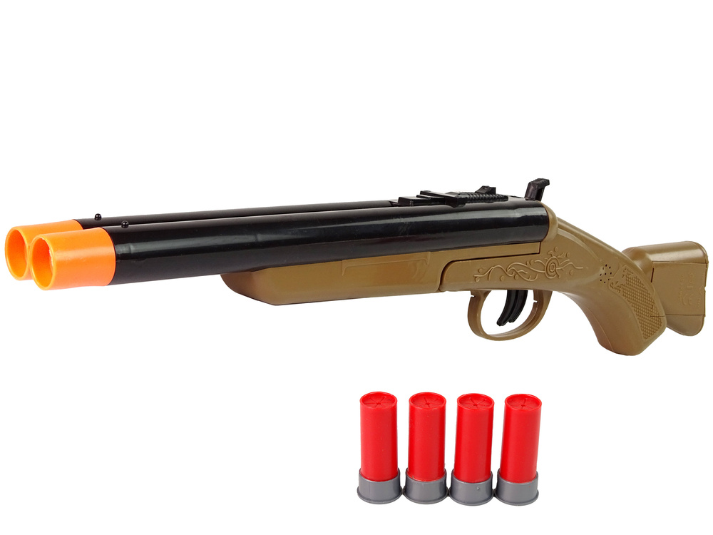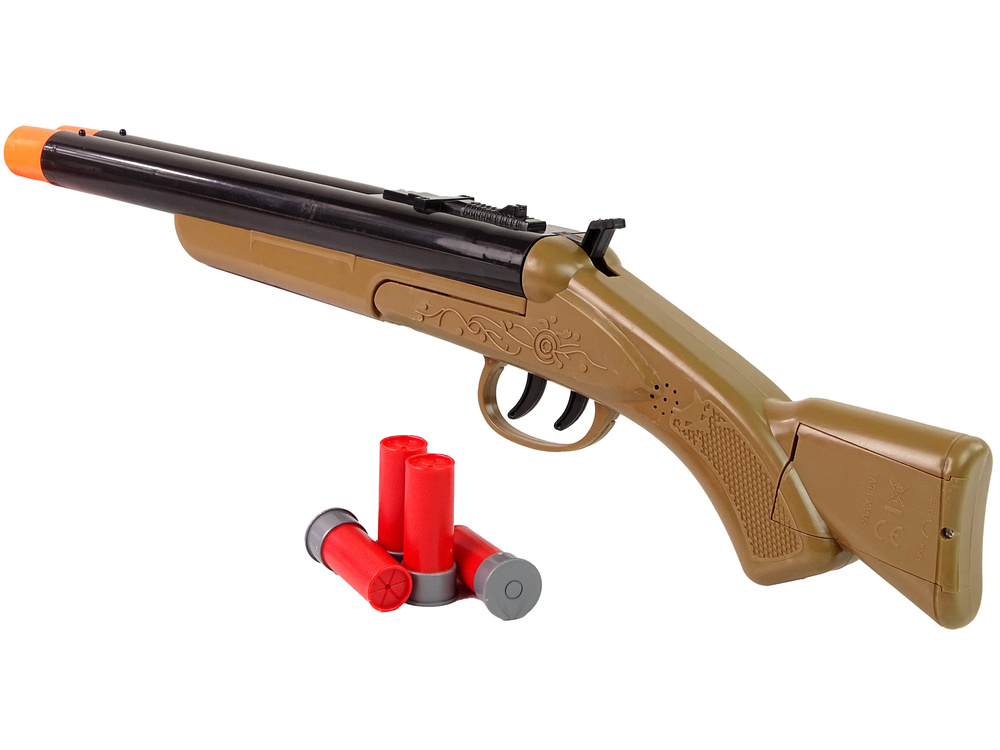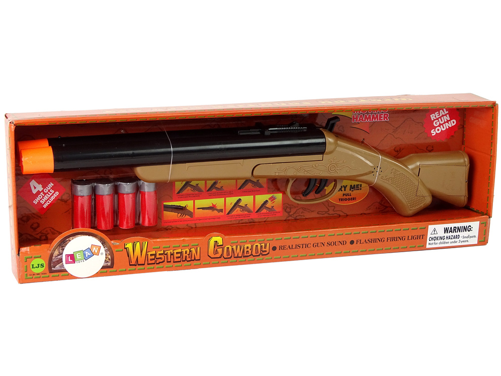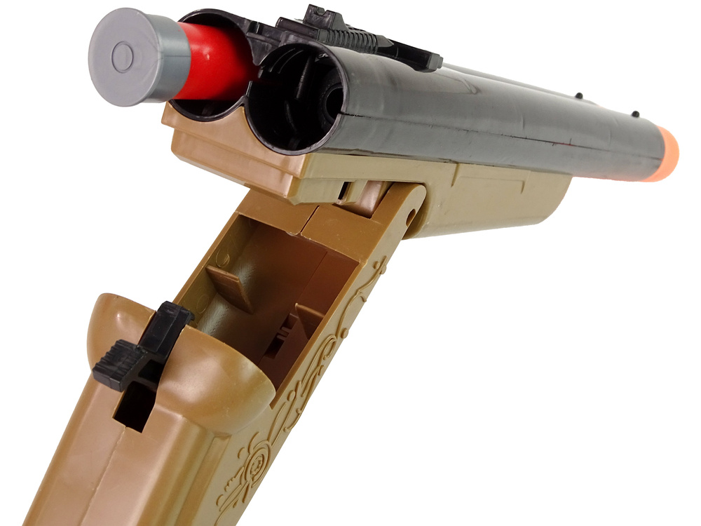 Strzelba wyglądem przypomina taką samą, jaką posiadają kowboje w westernach. W połowie pistoletu znajduje się wajcha, która składa ją na pół. Umożliwia to włożenie do środka ogromnych naboi. Kolejnym sprawnym ruchem w górę zamkniesz ją i jest gotowa do strzału. W środku znajdują się dwa miejsca na naboje, jednocześnie możesz oddać dwa strzały. Nie wystrzelą jednocześnie, dwa spusty pozwolą na odpalenie jeden za drugim. Strzelba daje jedynie efekty dźwiękowe, z lufy nic nie wylatuje, co gwarantuje bezpieczeństwo dla Twojego dziecka.