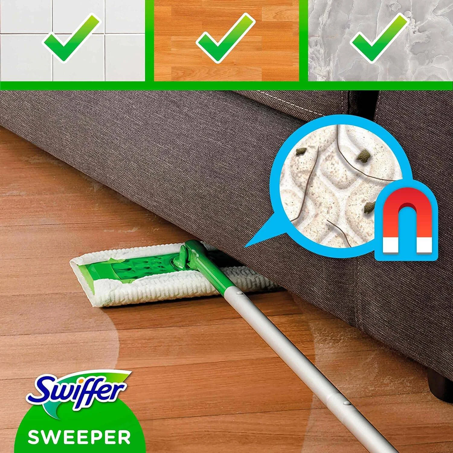 System Swiffer nadaje się zarówno do czyszczenia na sucho, jak i na mokro. Zestaw zawiera grube, suche ściereczki, które pochłaniają do 3 razy więcej brudu*, kurzu i sierści w porównaniu z konwencjonalnymi miotłami. Specjalnie zaprojektowana gruba tkanina o unikalnej strukturze 3D dopasowuje się do powierzchni podłogi. W zestawie znajdują się również wilgotne ściereczki podłogowe o unikalnej strukturze 3D, które usuwają i zatrzymują brud i kurz, pozostawiając świeży zapach. Dzięki obrotowej głowicy 360° możesz wycierać w dowolnym miejscu – nawet w trudno dostępnych miejscach.