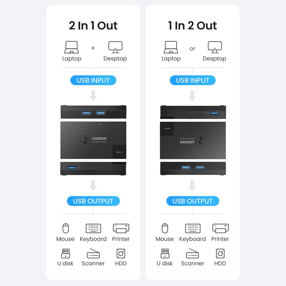 Ułatw sobie życie dzięki przełącznikowi USB 3.0 od Ugreen. Pozwala on na podłączenie dwóch komputerów do jednego urządzenia USB. Dzięki temu nie musisz już ciągle przepinać kabli. Wystarczy jeden ruch, aby udostępnić urządzenie drugiemu komputerowi.