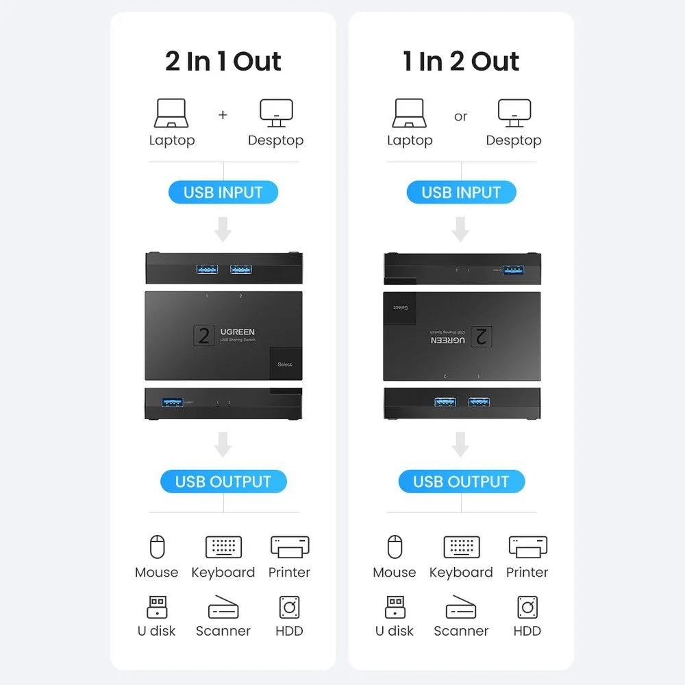 Switch przełącznik USB 3.0 dwukierunkowy na dwa komputery czarny to innowacyjne rozwiązanie, które ułatwia codzienne korzystanie z urządzeń USB. Przełącznik od marki Ugreen pozwala na podłączenie dwóch komputerów do jednego urządzenia USB, eliminując konieczność ciągłego przepinania kabli.