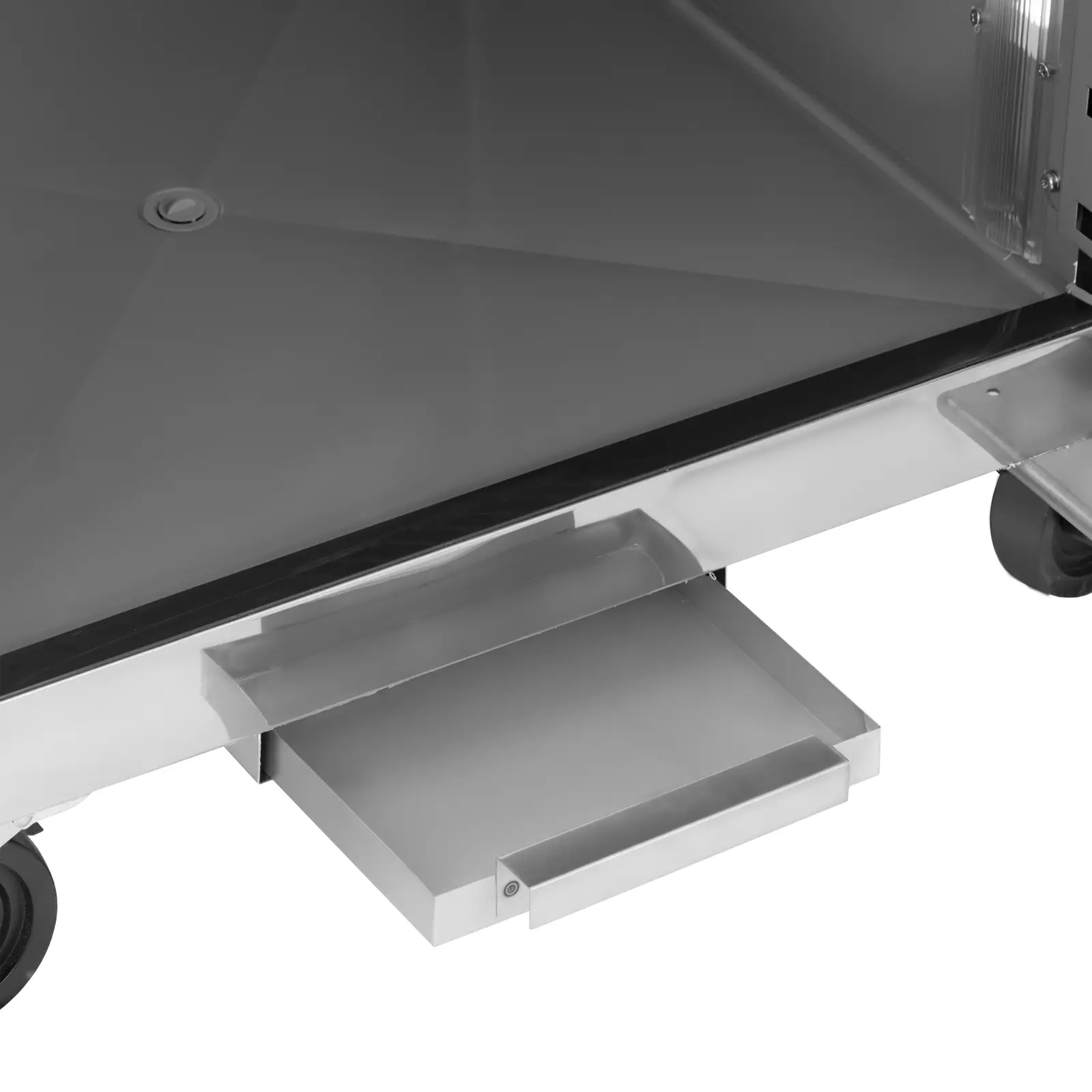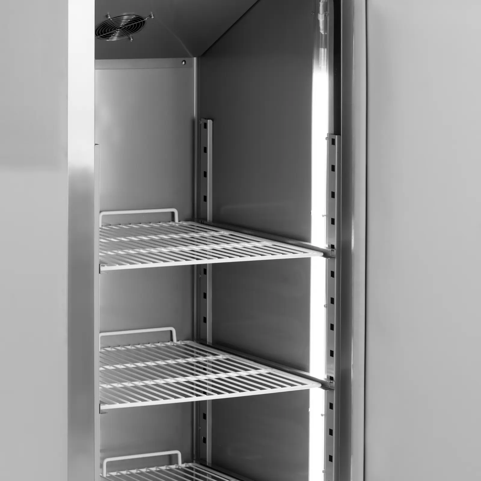Obudowa lodówki wykonana jest ze stali nierdzewnej, co zapewnia jej trwałość i łatwość w utrzymaniu czystości.