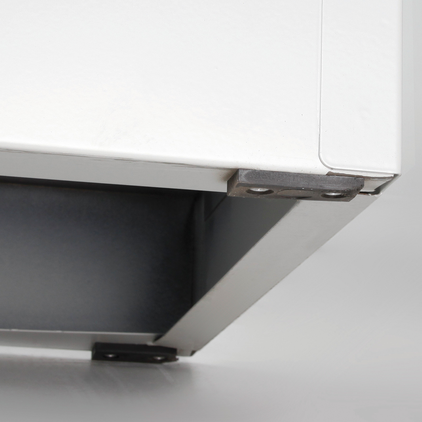 Szafa wykonana jest z wysokiej jakości blachy stalowej, co zapewnia jej trwałość i stabilność. Zamek patentowy z dwoma ryglami chroni zawartość przed dostępem osób niepowołanych. Wzmocnione drzwi oraz malowanie proszkowe w kolorze szarym (RAL 7035) i niebieskim (RAL 5012) dodają estetyki i funkcjonalności.