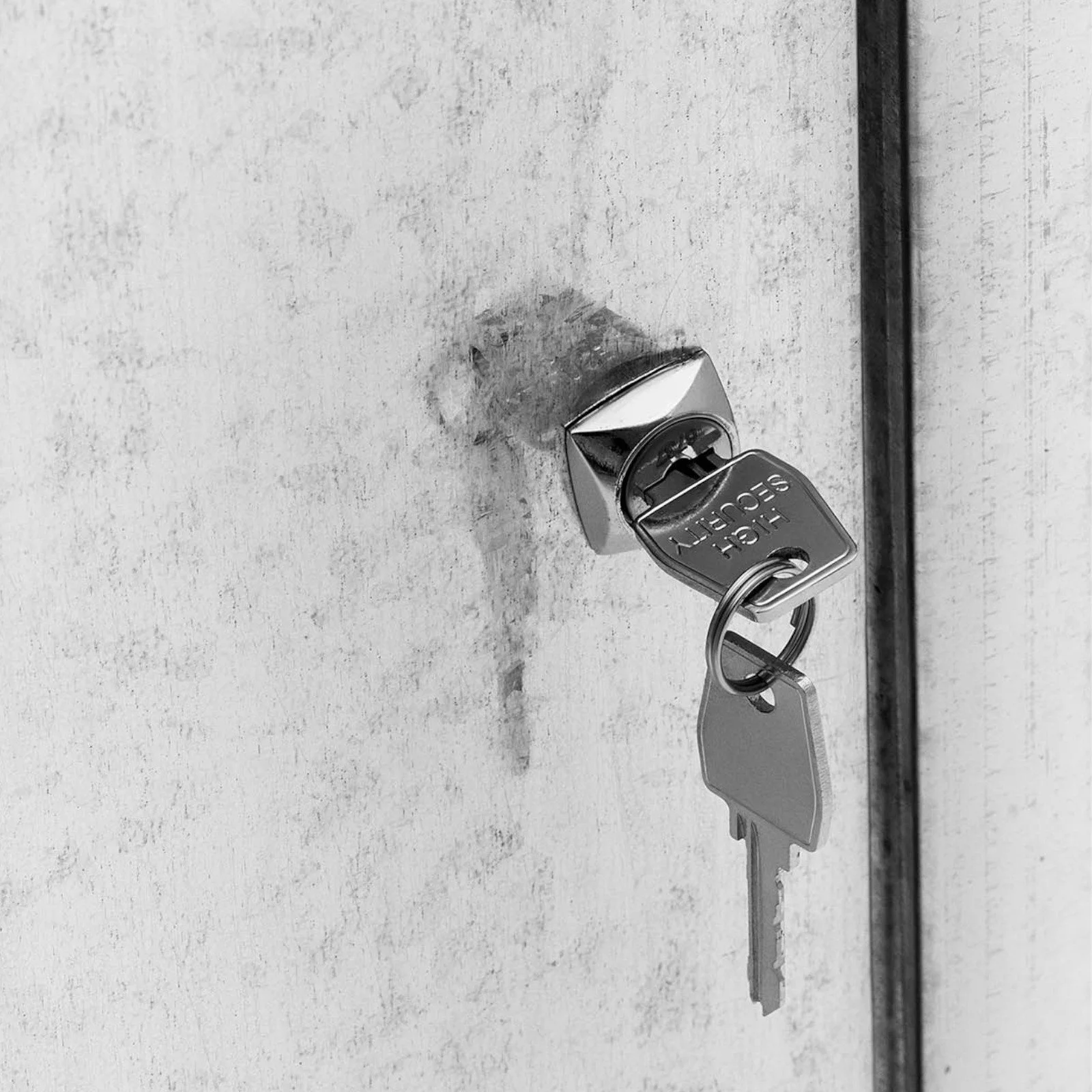 Szafka wykonana jest z metalu o grubości 0,8 mm, co zapewnia jej trwałość i stabilność. Zamykana na klucz, gwarantuje bezpieczeństwo przechowywanych rzeczy. W zestawie znajdują się dwa klucze.