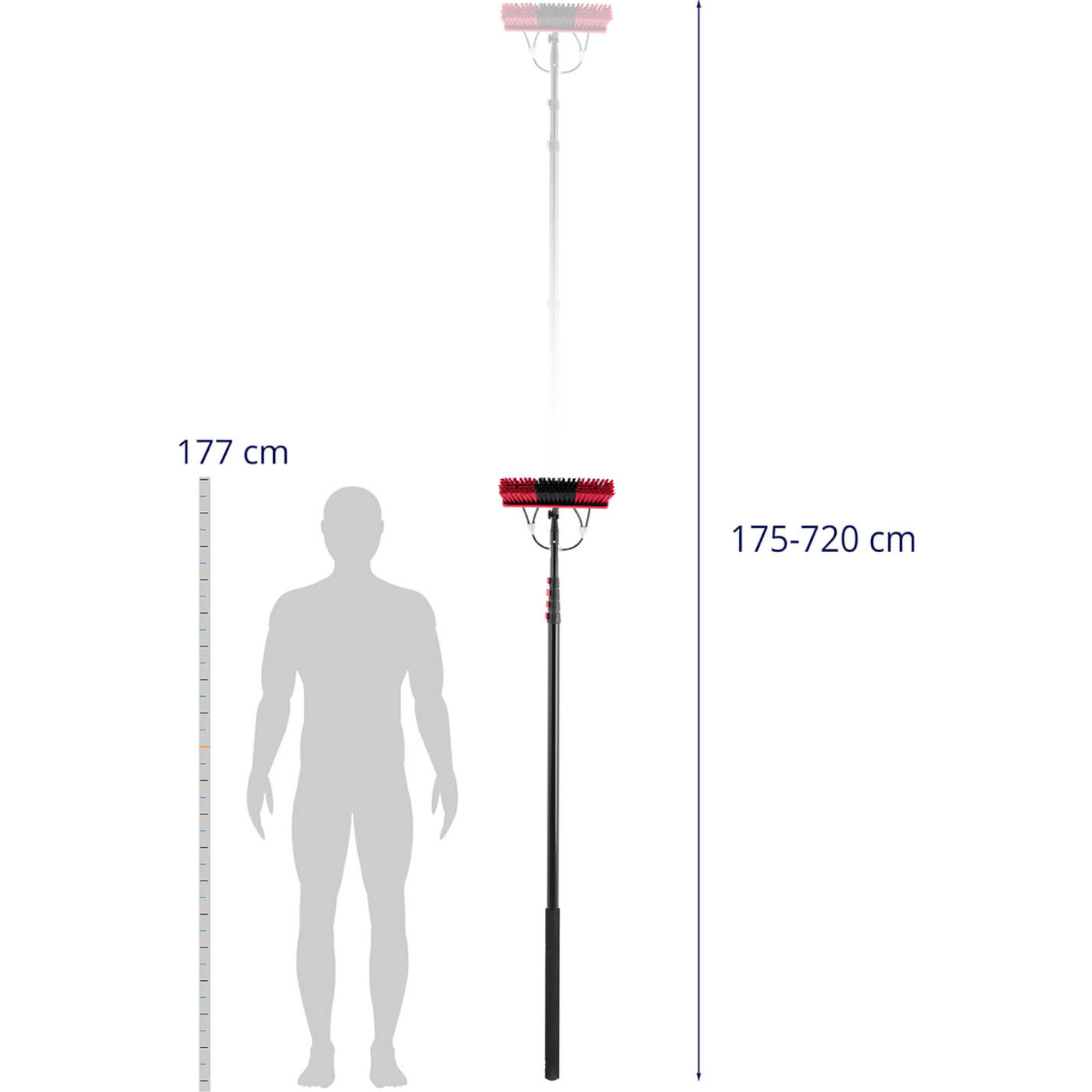 Urządzenie można wydłużyć do 7200 mm, co pozwala na mycie wysoko położonych powierzchni bez użycia drabiny. Po złożeniu ma długość 1750 mm, co ułatwia przechowywanie. Wraz z 5 sekcjami oprysku oraz ergonomicznym uchwytem, myjka zapewnia komfort podczas użytkowania.