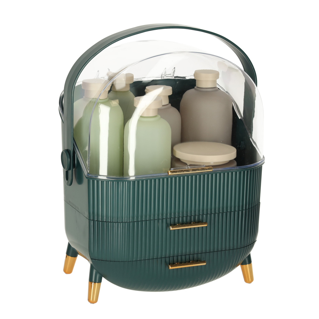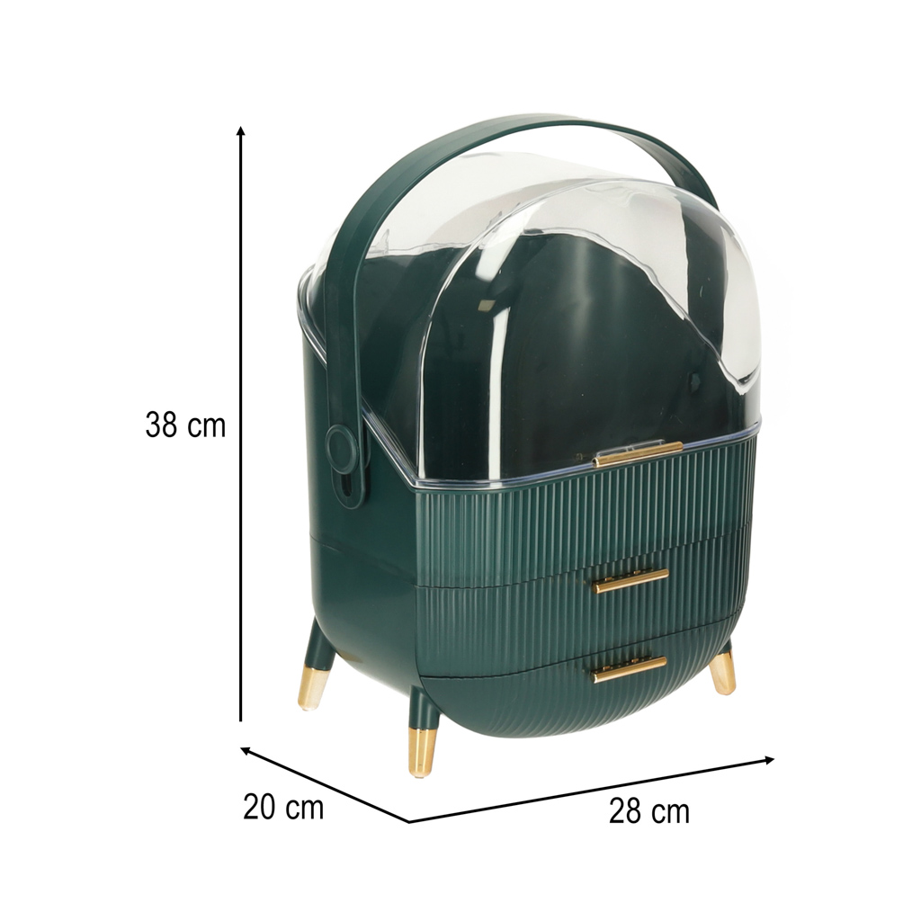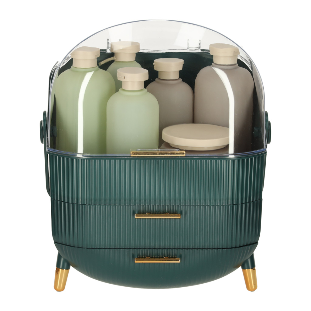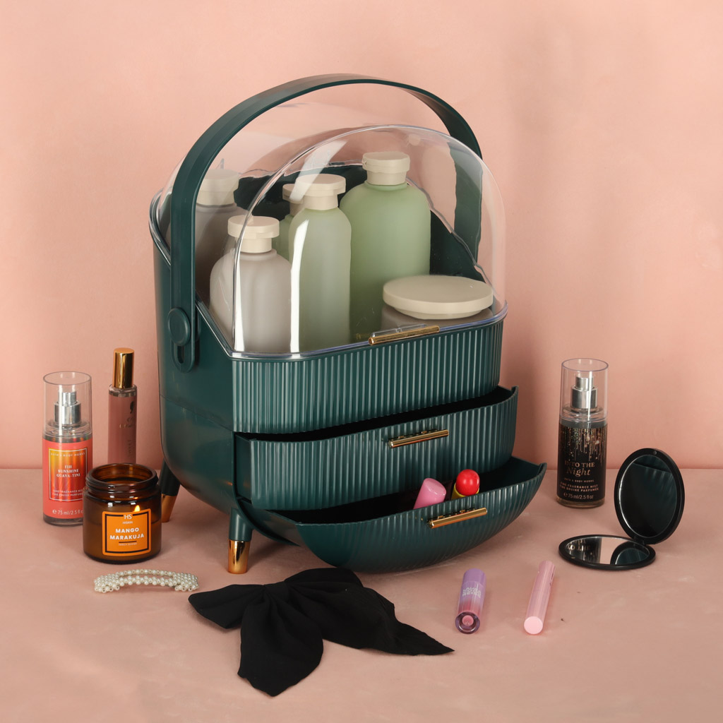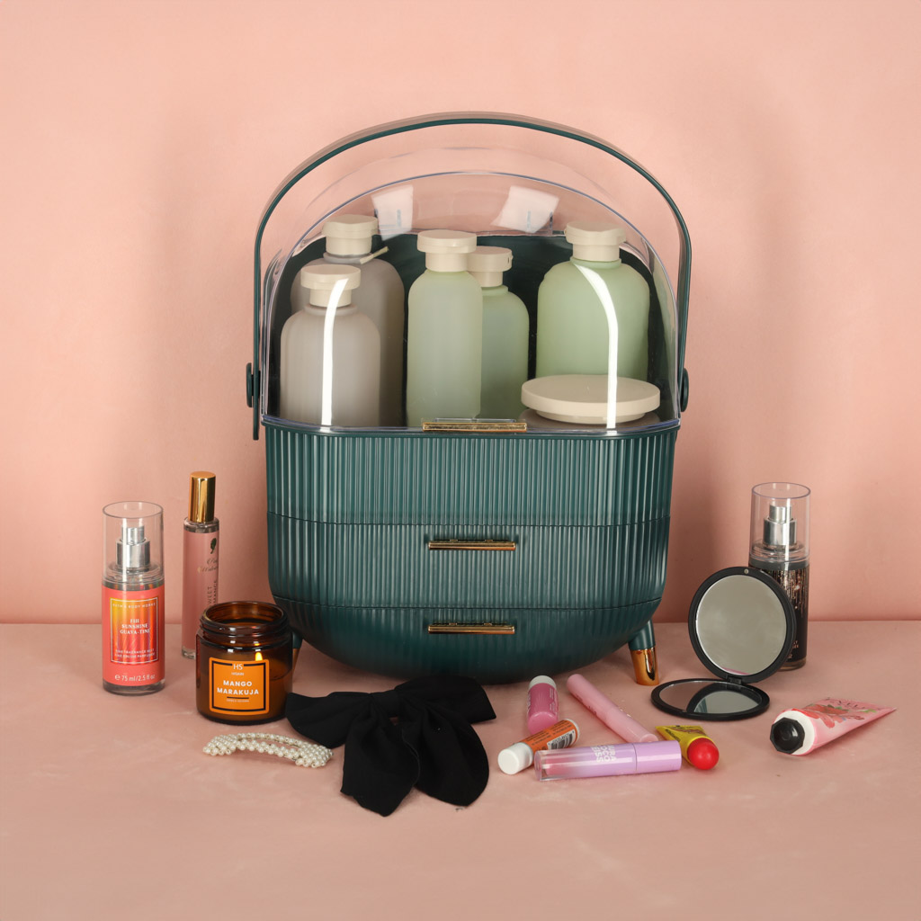Organizer wyposażony jest w dwie pojemne wysuwane szufladki, które pomieszczą wszystko, od kremów po biżuterię. Górna półka doskonale sprawdzi się jako stojak na kosmetyki, dzięki czemu Twoje ulubione produkty będą zawsze pod ręką.